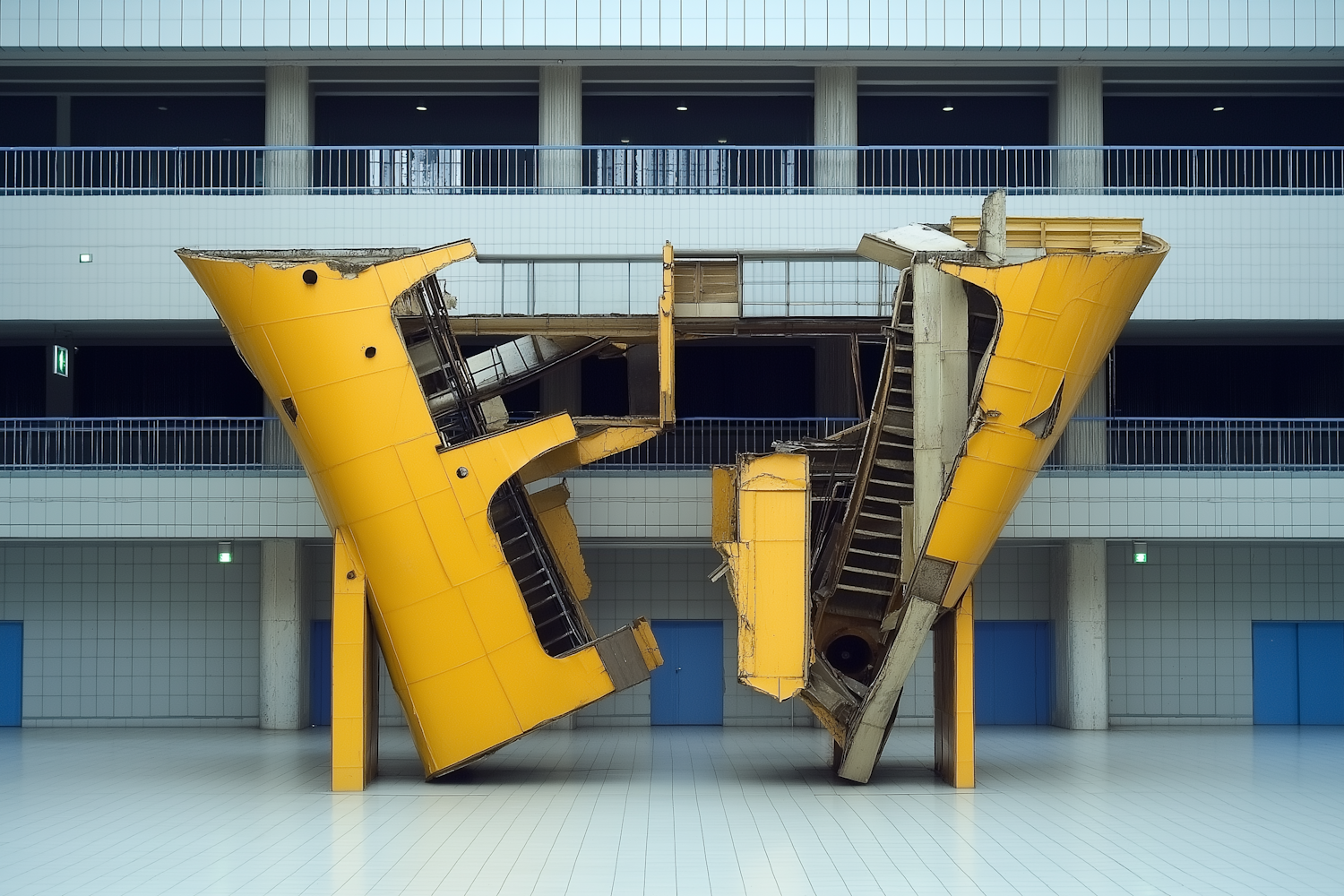 A bold yellow deconstructed structure with visible staircases in a modern, tiled atrium. Industrial and artistic vibes collide in this unique space.