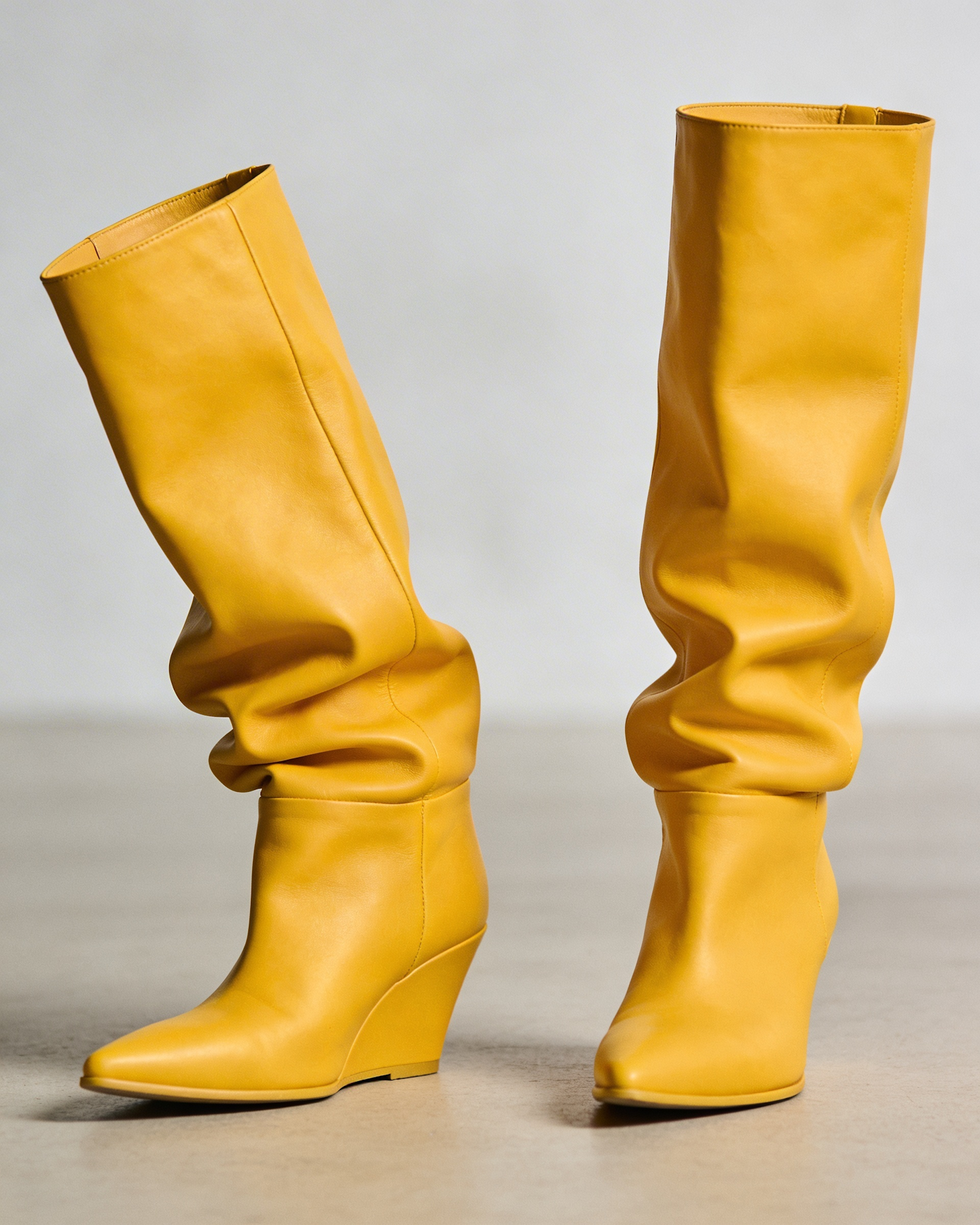 A yellow boot, one boot slouches heavily at the ankle, the other slouches at the calf, creating a mirrored asymmetry that feels intentional and editorial.
