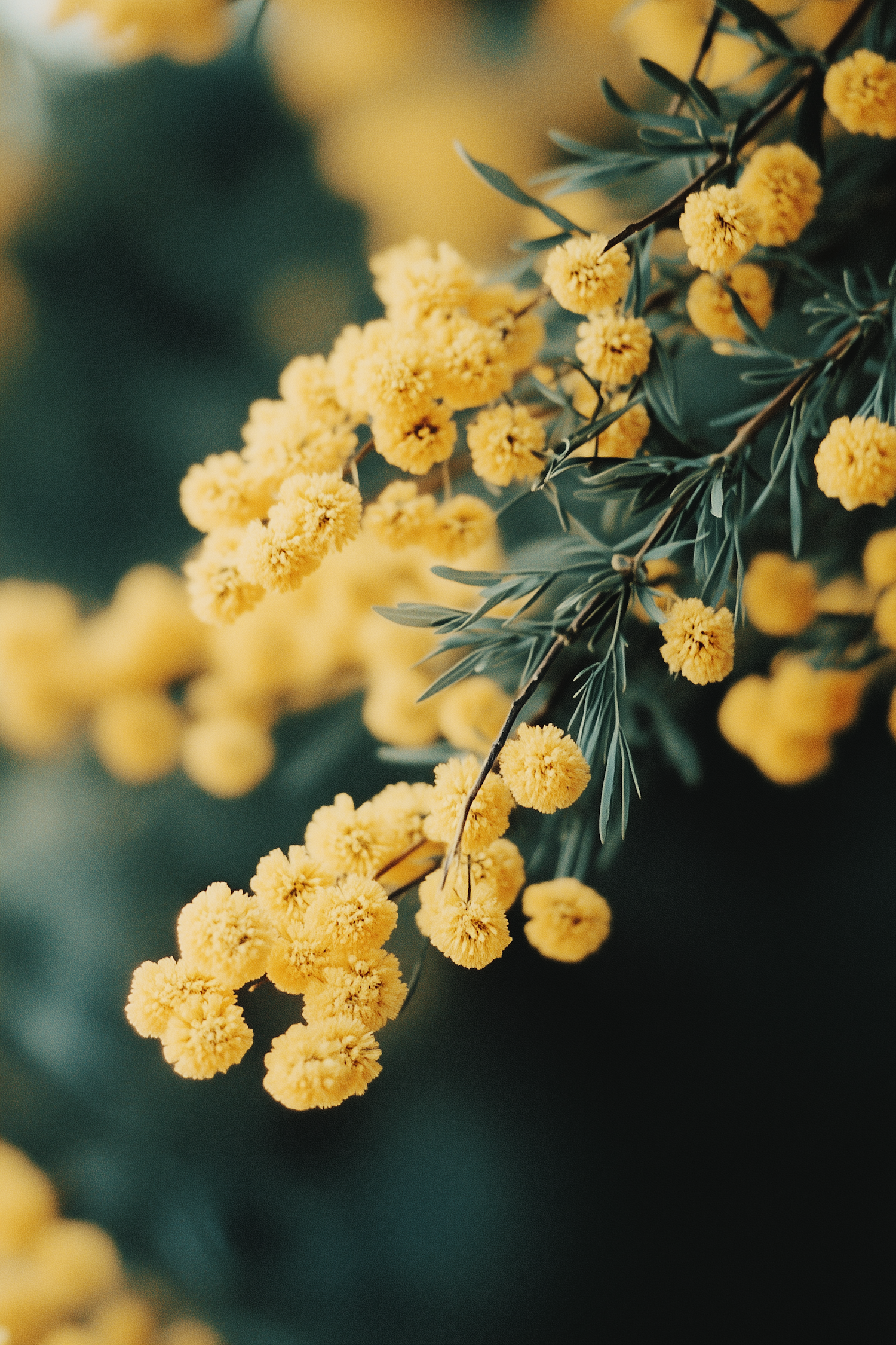 Bright yellow mimosa flowers in full bloom with soft green leaves, set against a blurred background for a dreamy, natural vibe.