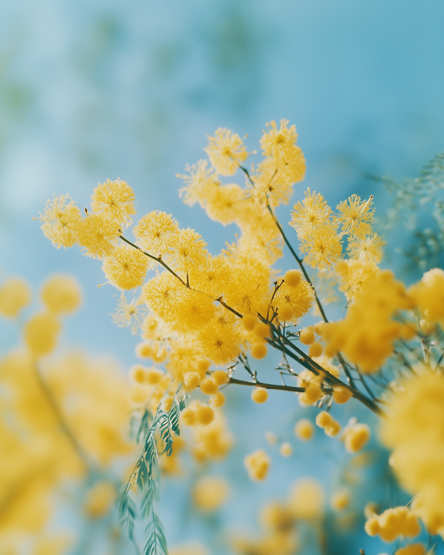 Bright yellow mimosa flowers with delicate green leaves against a dreamy blue background, creating a serene and uplifting scene.