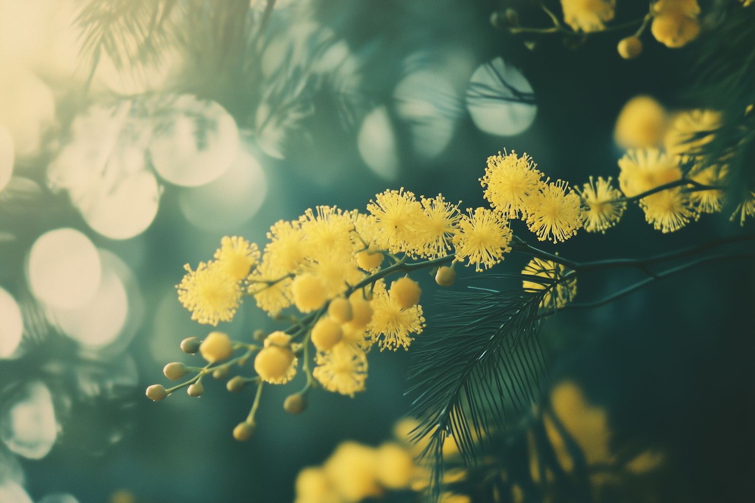 Bright yellow mimosa flowers in full bloom with a dreamy green bokeh background, creating a serene and vibrant nature scene.