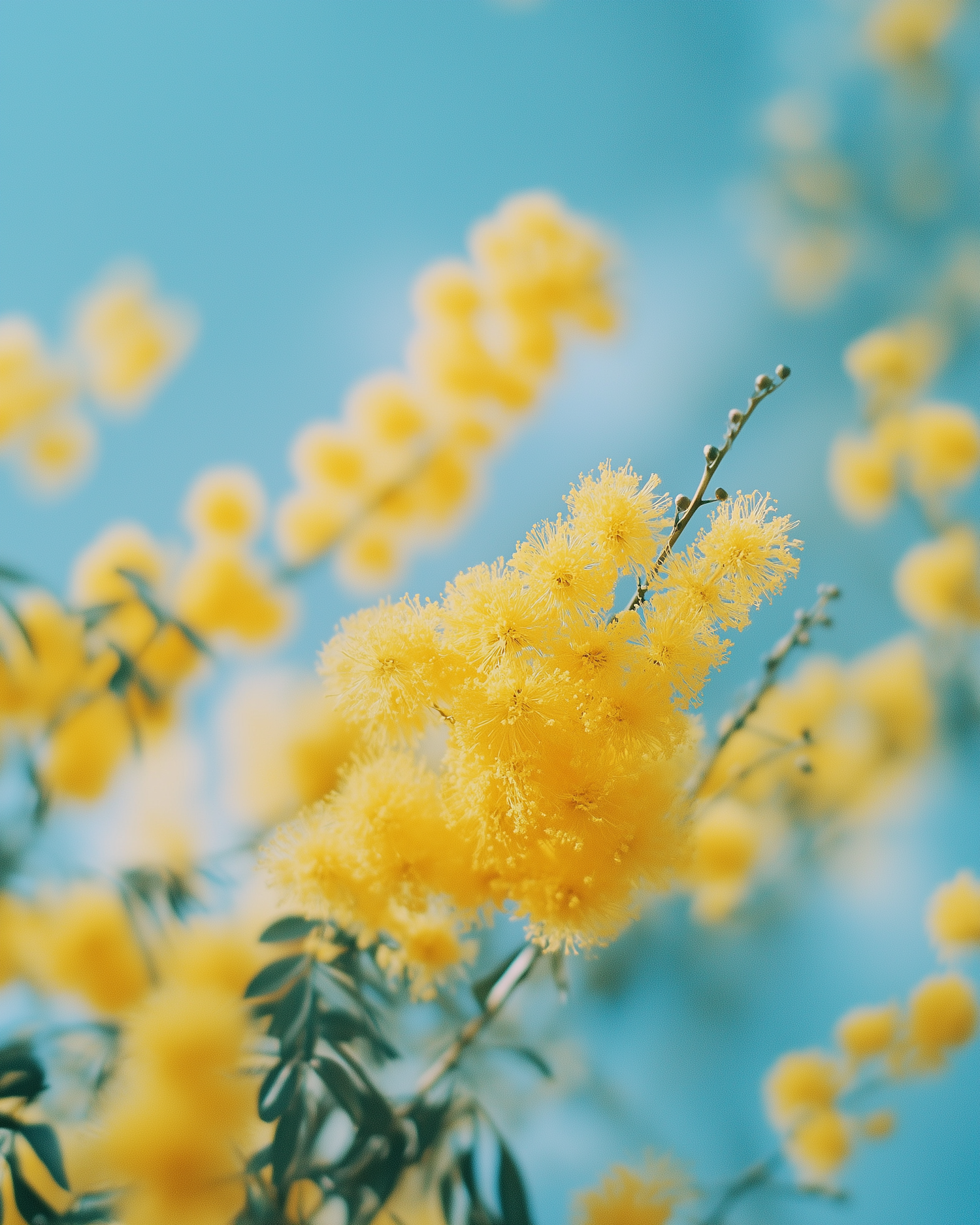 Bright yellow mimosa flowers with soft green leaves pop against a dreamy turquoise background, evoking a serene springtime vibe.
