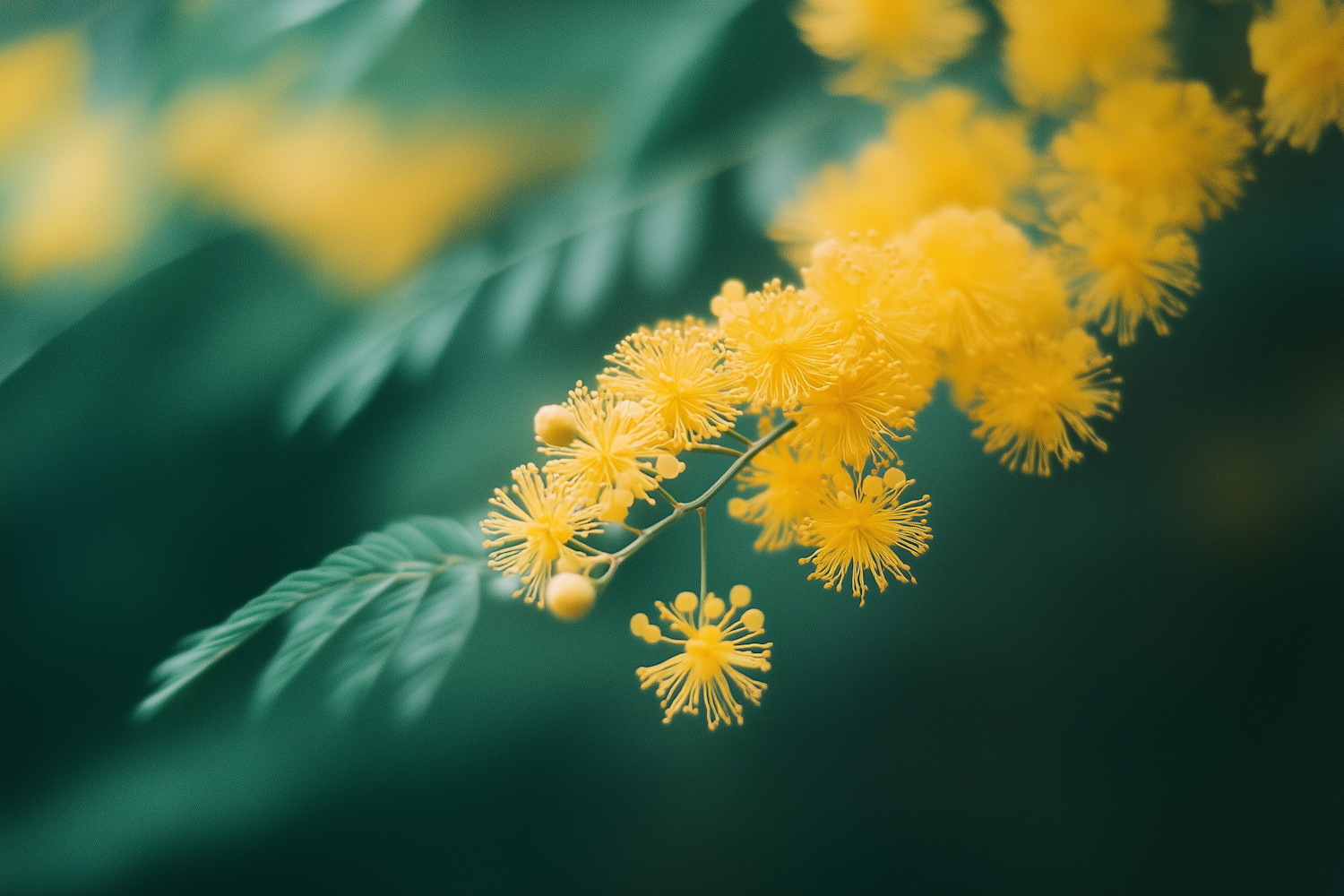Bright yellow mimosa flowers with feathery green leaves, captured in a soft-focus natural setting. Perfect for nature lovers.