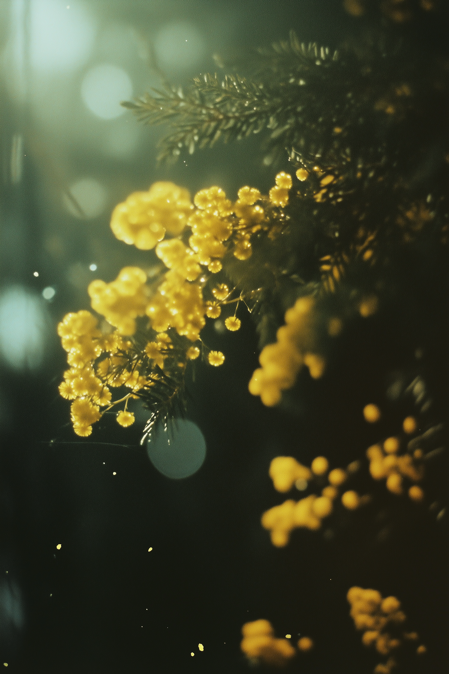 Close-up of yellow mimosa flowers with soft lighting, dark blurred background, and dreamy bokeh lights for a serene, natural vibe.