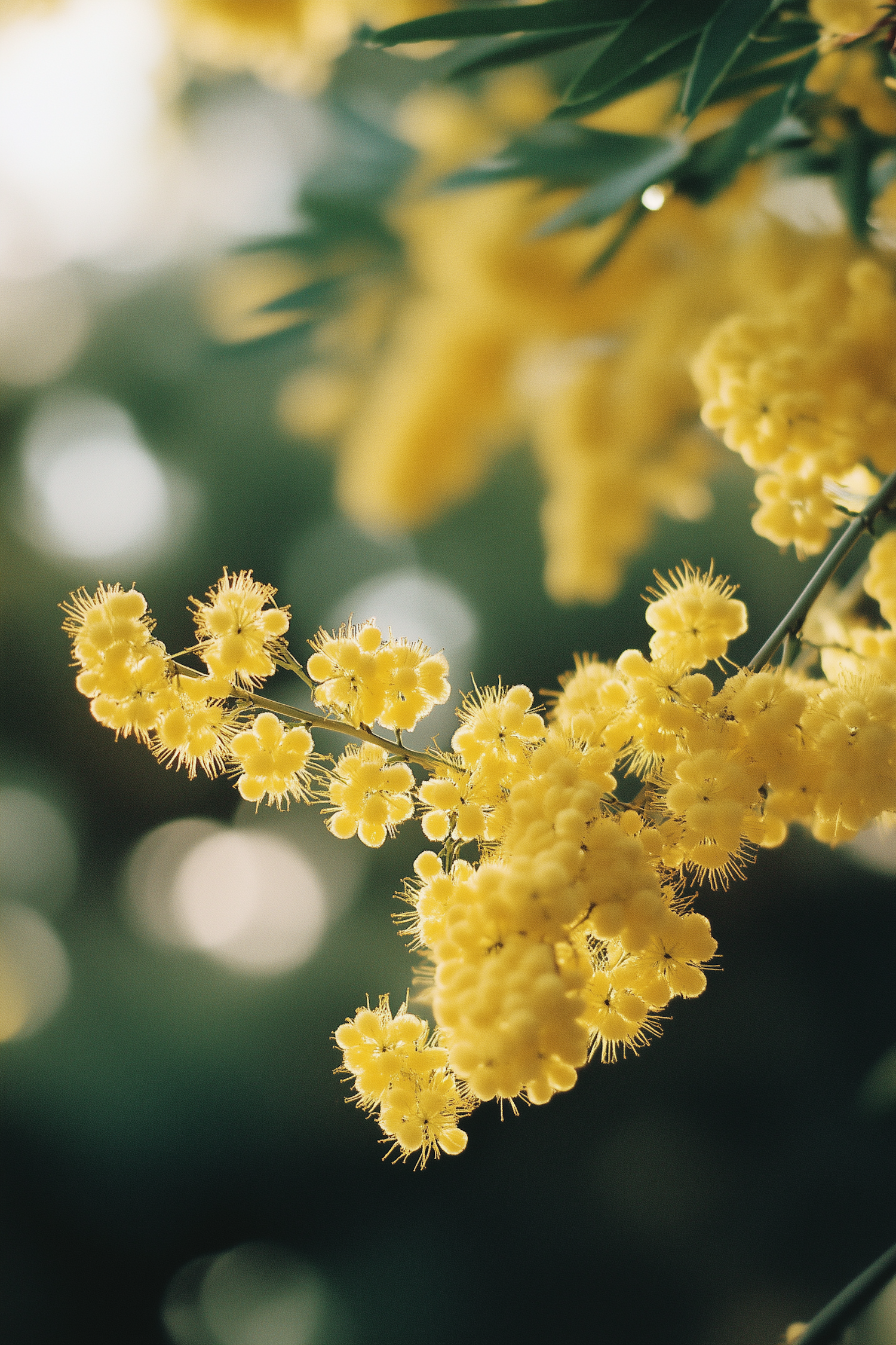 Bright yellow mimosa flowers in full bloom with soft green bokeh background, showcasing their delicate, fluffy texture.