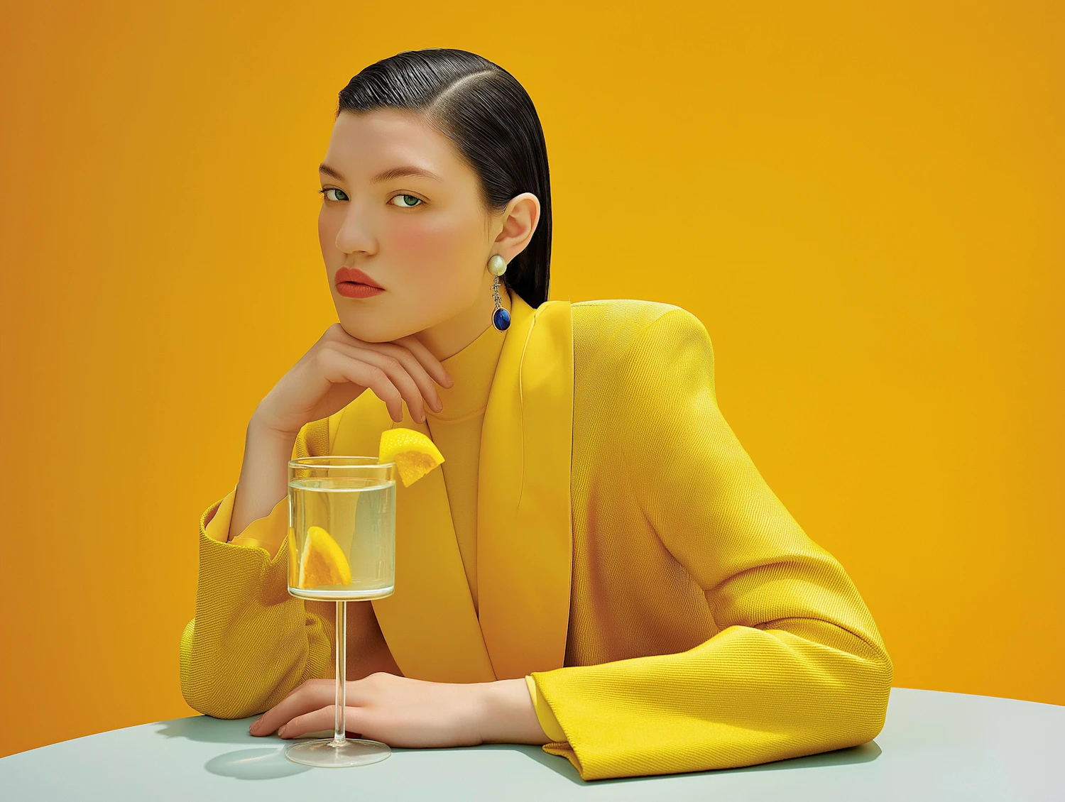 Elegant woman in a yellow blazer against a yellow background, with a glass of lemon water and a bold blue earring.