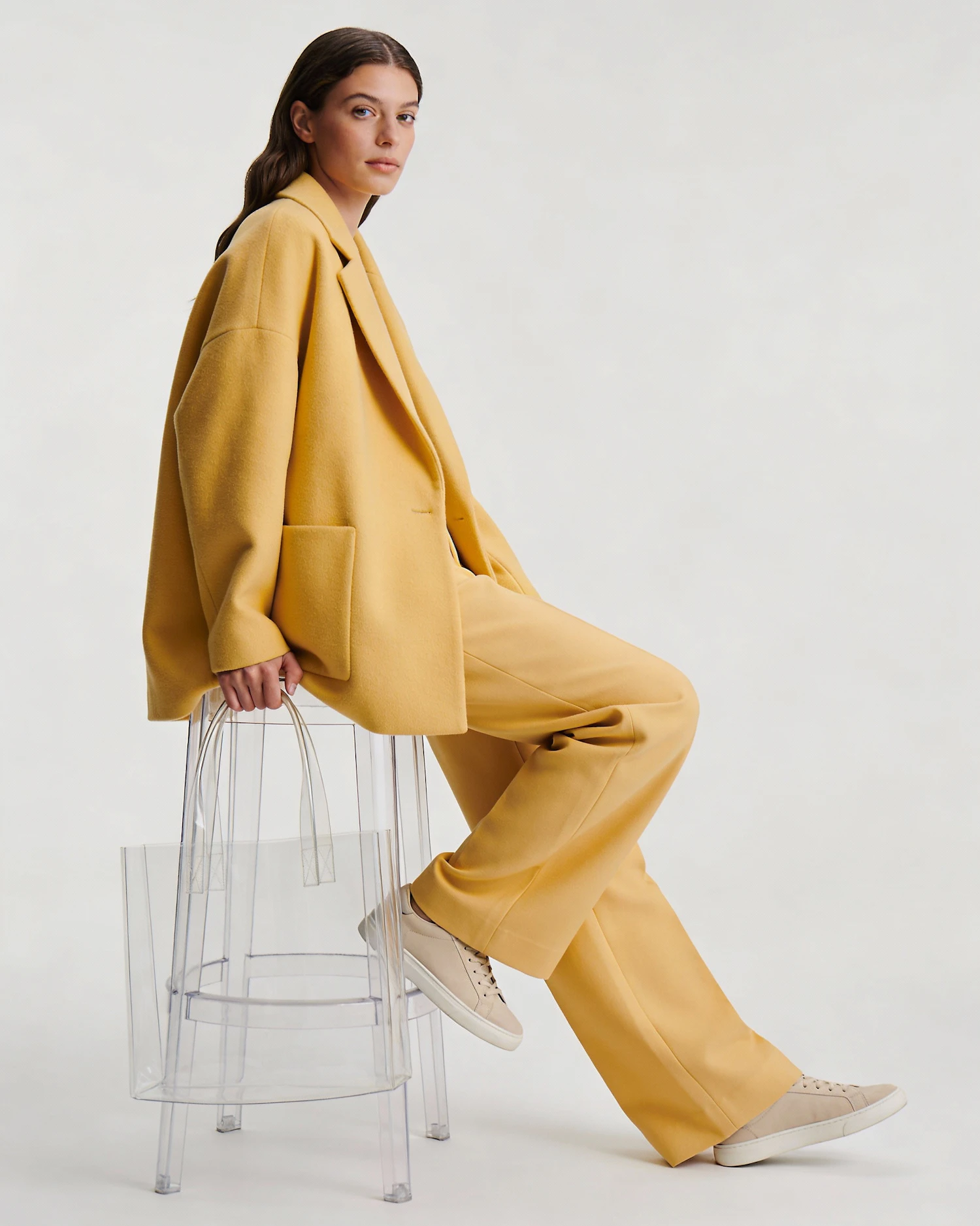 Ultra-realistic fashion lookbook photo, full-body model on a matte off-white studio seamless, outfit: lemon-yellow oversized coat + matching wide-leg trousers + minimalist sneakers, prop: transparent acrylic stool + clear tote bag, pose: true side-profile view, seated tall with back straight, one leg extended forward, the other foot tucked closer to the stool, one hand resting on the stool edge, the other holding the clear tote by the handle, gaze forward (off-camera), soft studio key light, crisp fabric texture, 50mm look, clean editorial grading, sharp focus, no logos, no text, no watermark.