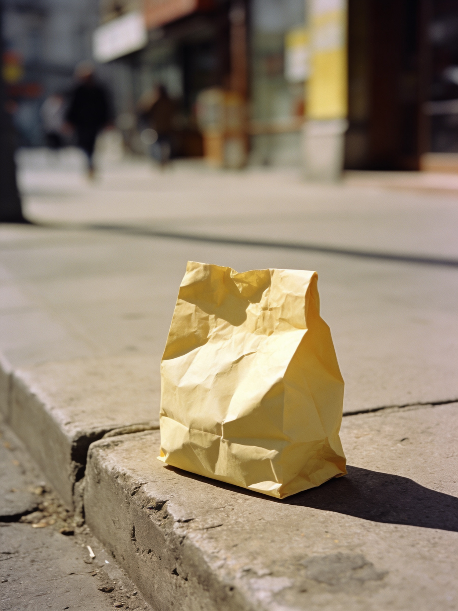 A yellow paper bag on a city curb, with blurred urban background and natural lighting highlighting its texture and color.