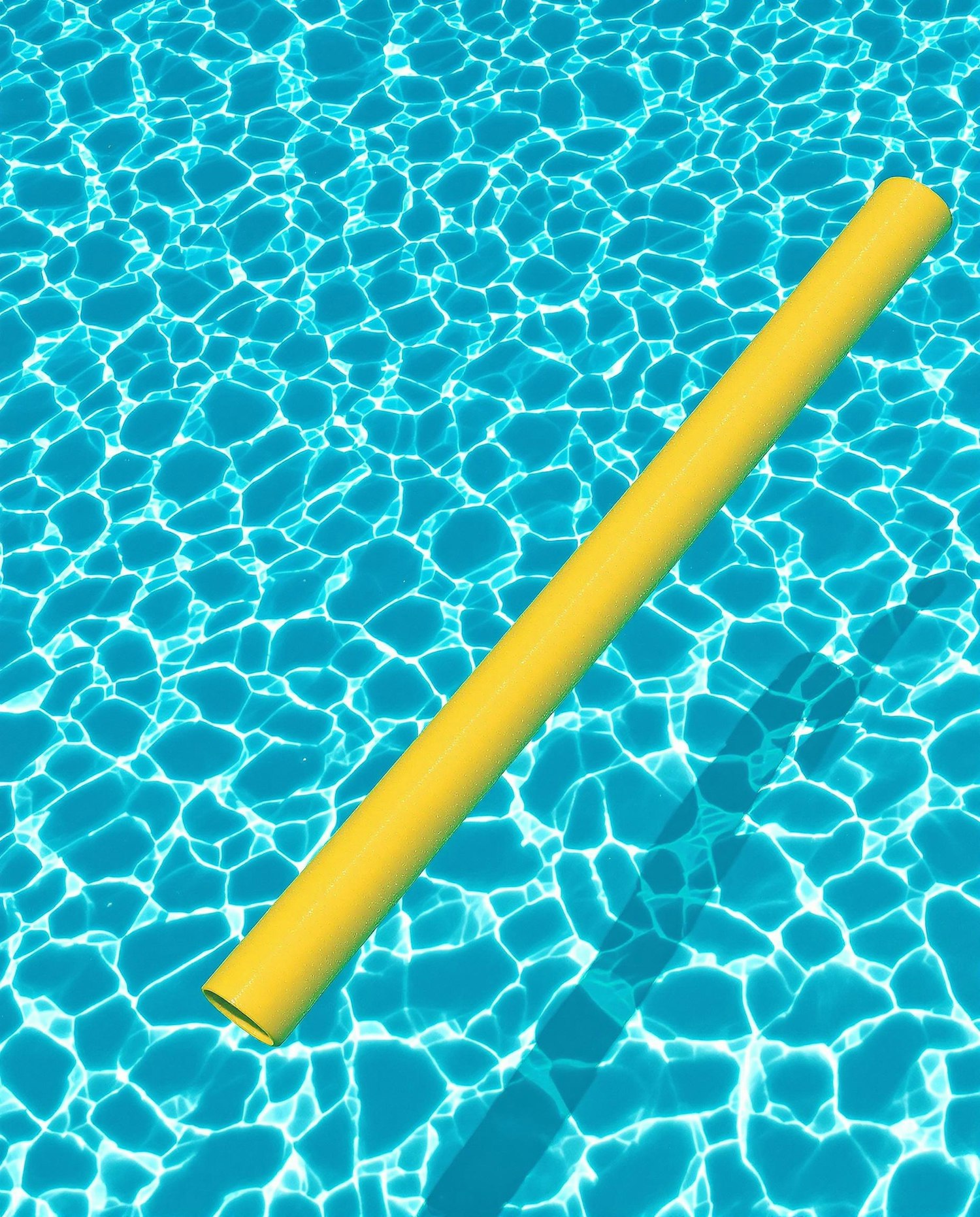 Bright yellow pool noodle floating on clear blue water with shimmering sunlight reflections, perfect summer vibes.