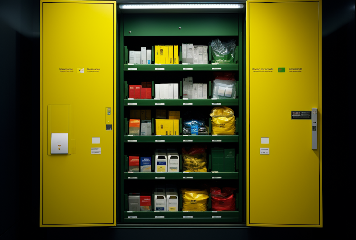 Open yellow storage cabinet with organized shelves of colorful boxes and containers, set against a green interior.