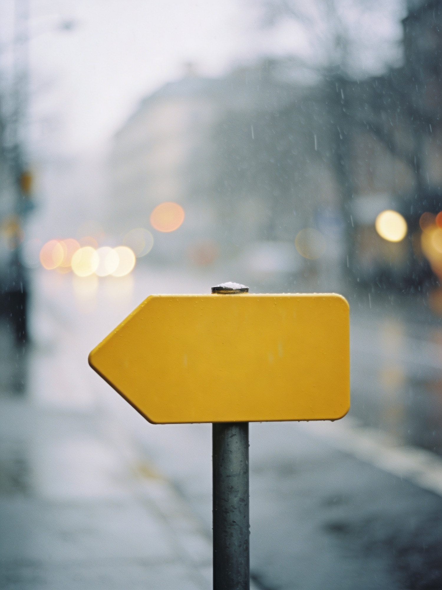 Cinematic street photography, minimal urban framing, muted palette, soft overcast light, gentle film grain, subtle halation, shallow depth of field, 85mm lens look. Close-up of a yellow street sign shape on a pole, background city street blurred with bokeh and light rain haze, yellow pops naturally. No readable text, no logos, no brand names.
