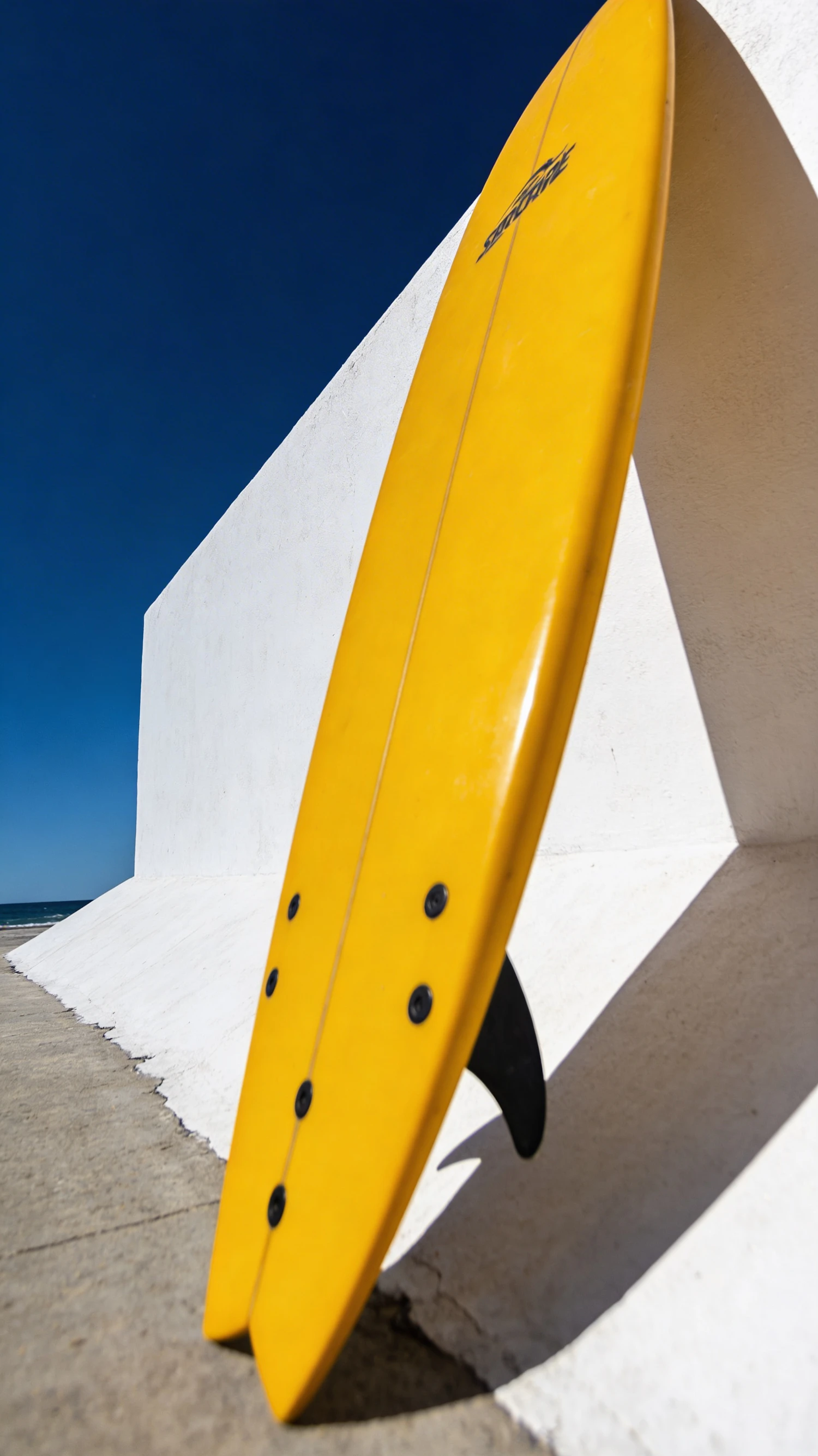 A bright yellow surfboard leaning against a minimalist white coastal wall, crisp sunlight, deep blue sky, clean shadows, no text.