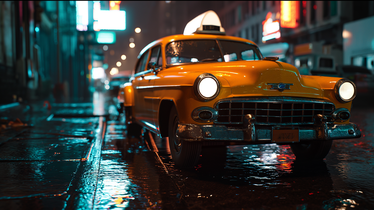 Vintage yellow taxi on a rainy city street at night, with neon reflections and a nostalgic, cinematic atmosphere.