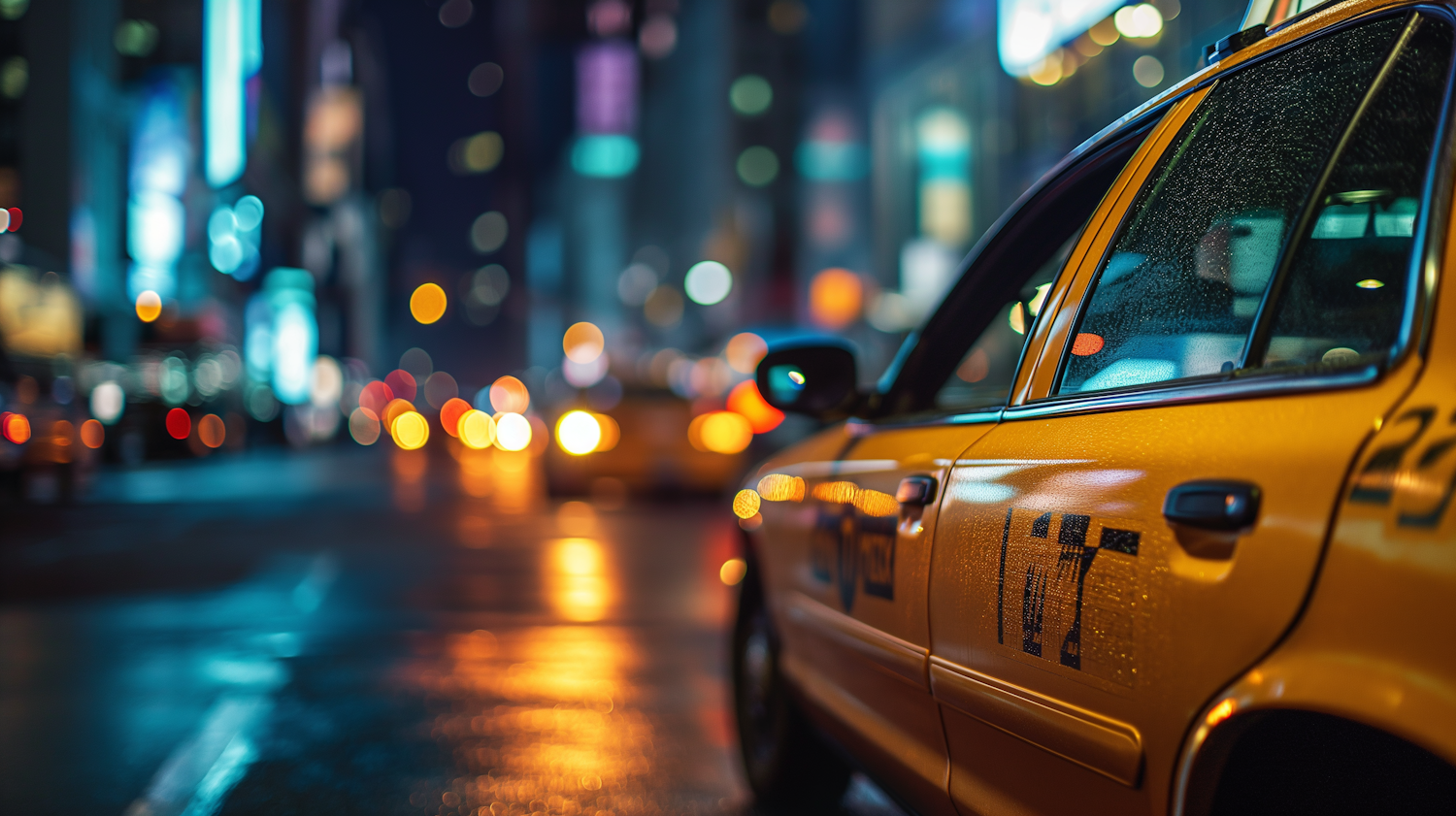 Yellow taxi in a vibrant city street at night, with colorful bokeh lights and reflections on wet pavement.