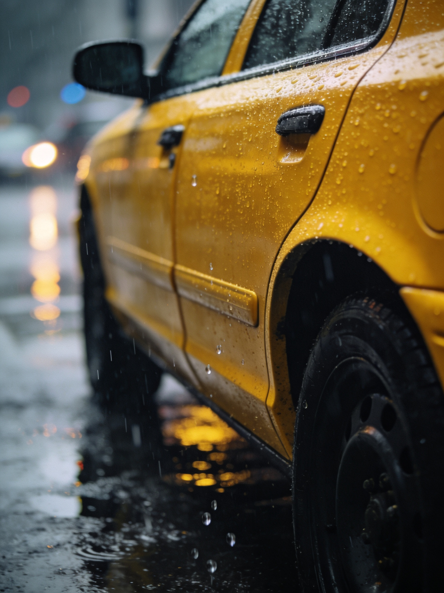 Cinematic street photography, realistic rain reflections, muted tones with yellow as the hero accent, gentle film grain, subtle halation, shallow depth of field, 50mm lens look, crisp texture. Close framing of a yellow taxi door and wheel, raindrops on paint, street reflections, background softly blurred. No logos, no readable text, no license plates, no brand names.