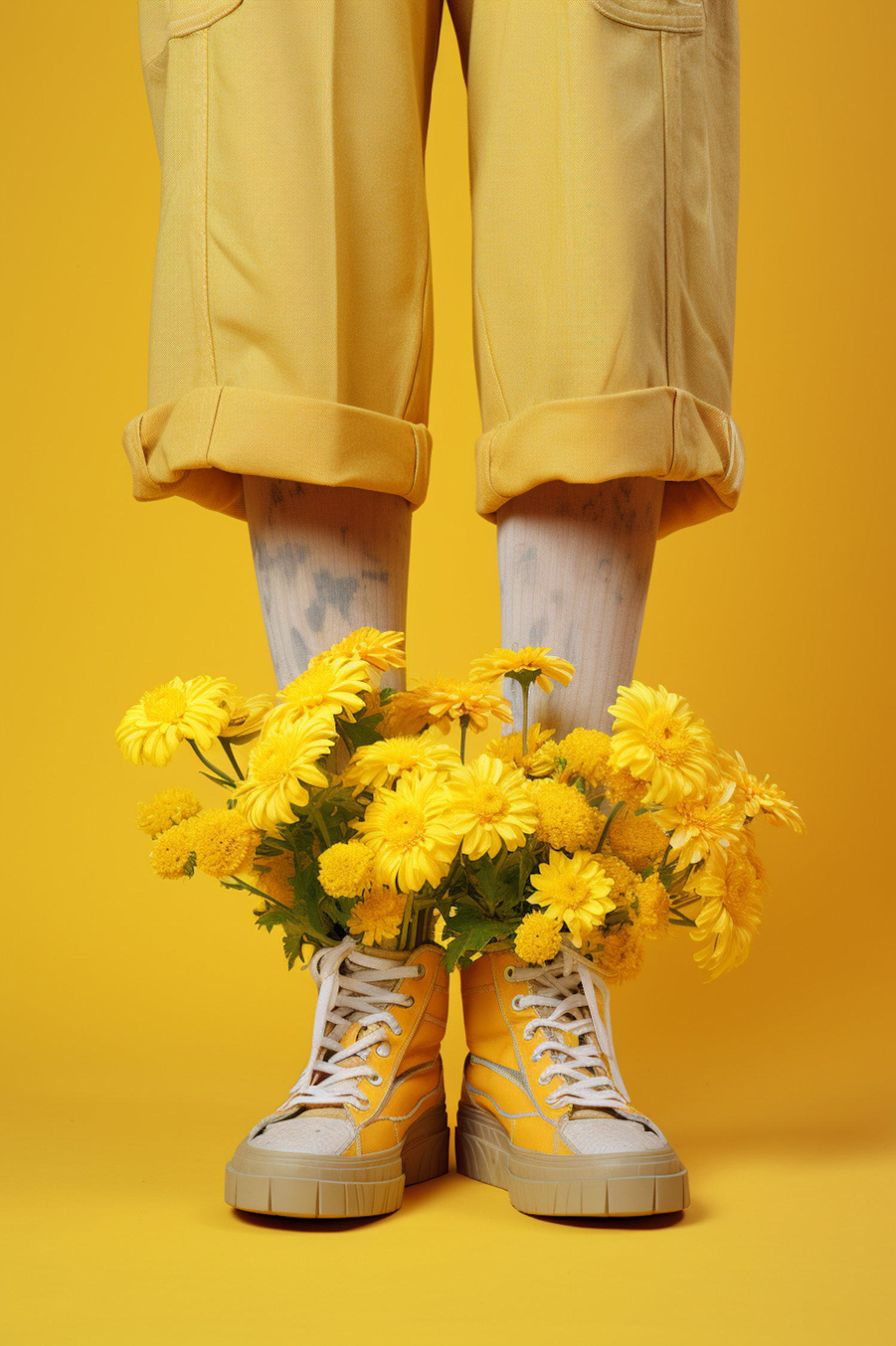 Yellow pants and sneakers filled with vibrant yellow flowers against a matching yellow background.