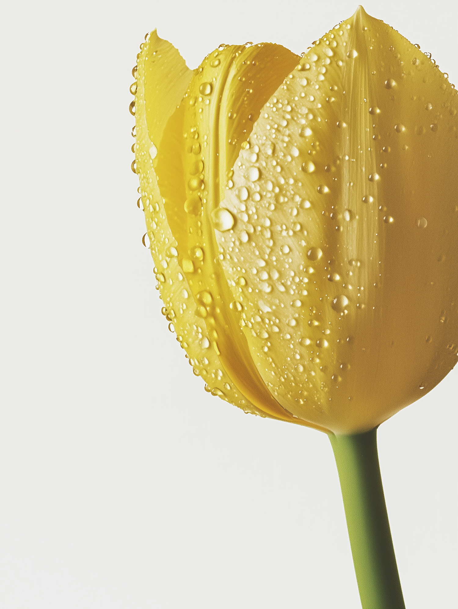 Close-up of a yellow tulip with water droplets on its petals, set against a soft pale background. Perfect for nature and floral enthusiasts.