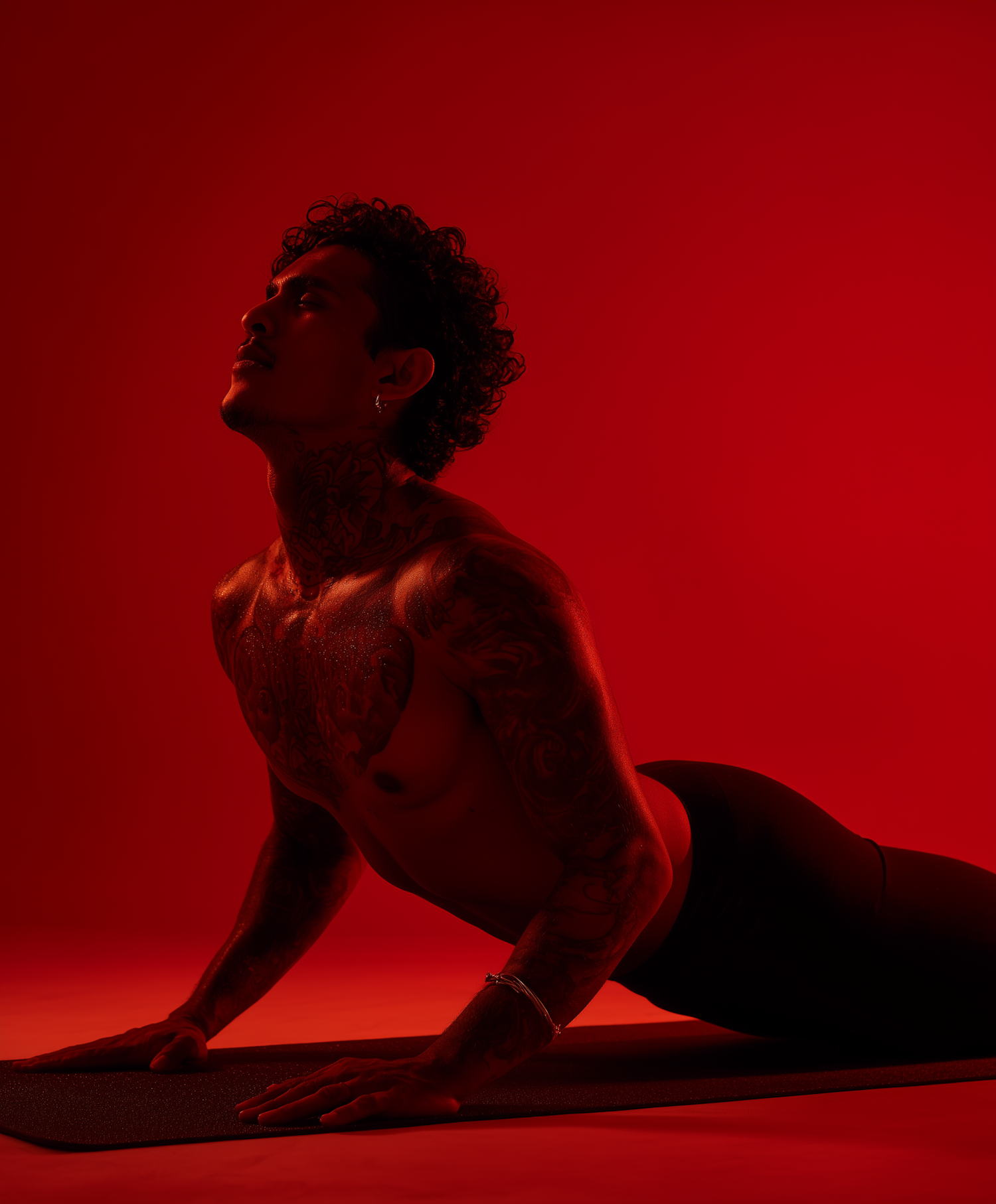 A man with tattoos performs a yoga pose under dramatic red lighting, creating a striking and intense visual effect.