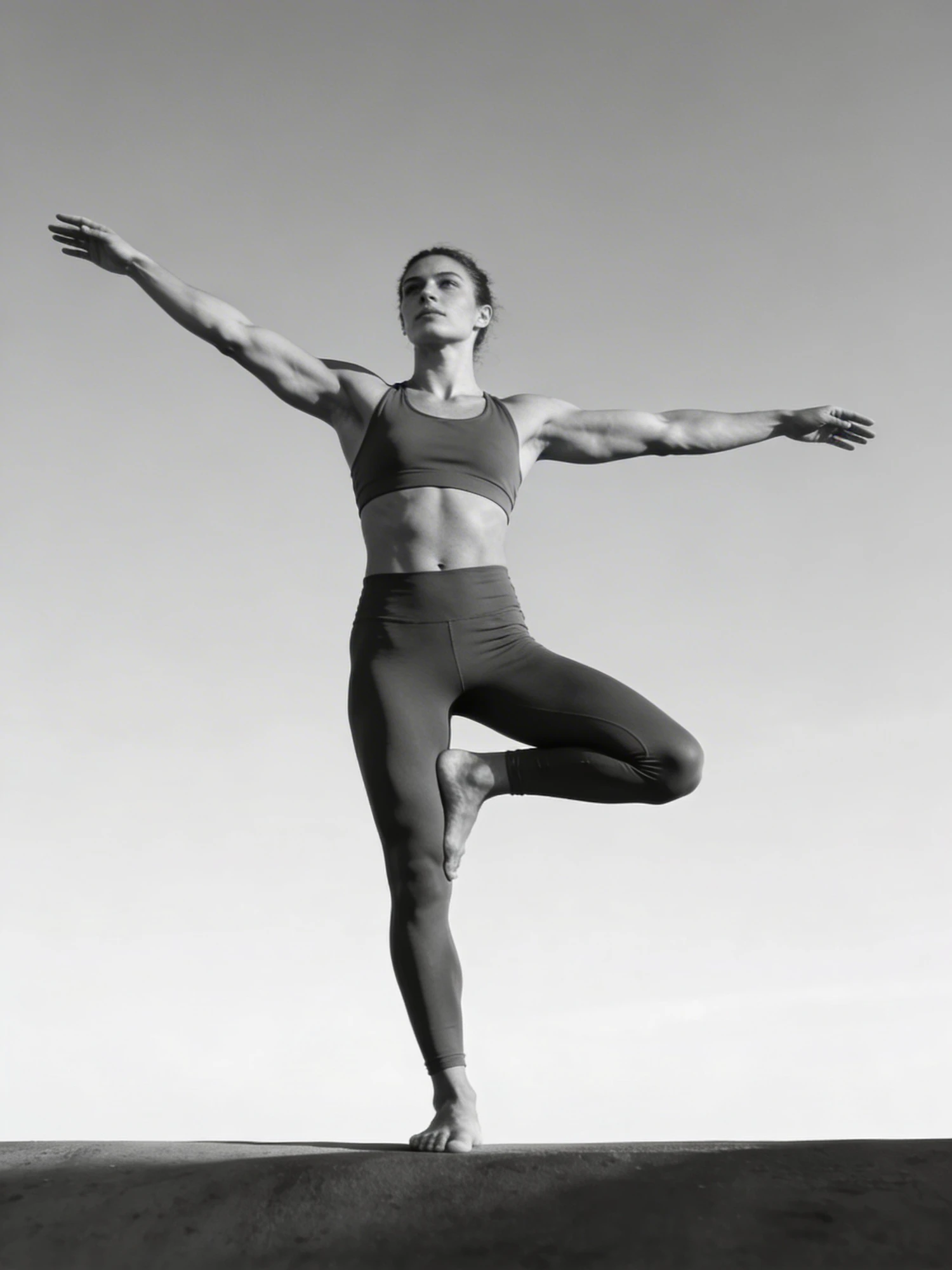 A black-and-white photo of a person in a yoga pose outdoors, showcasing balance and strength against a clear sky.
