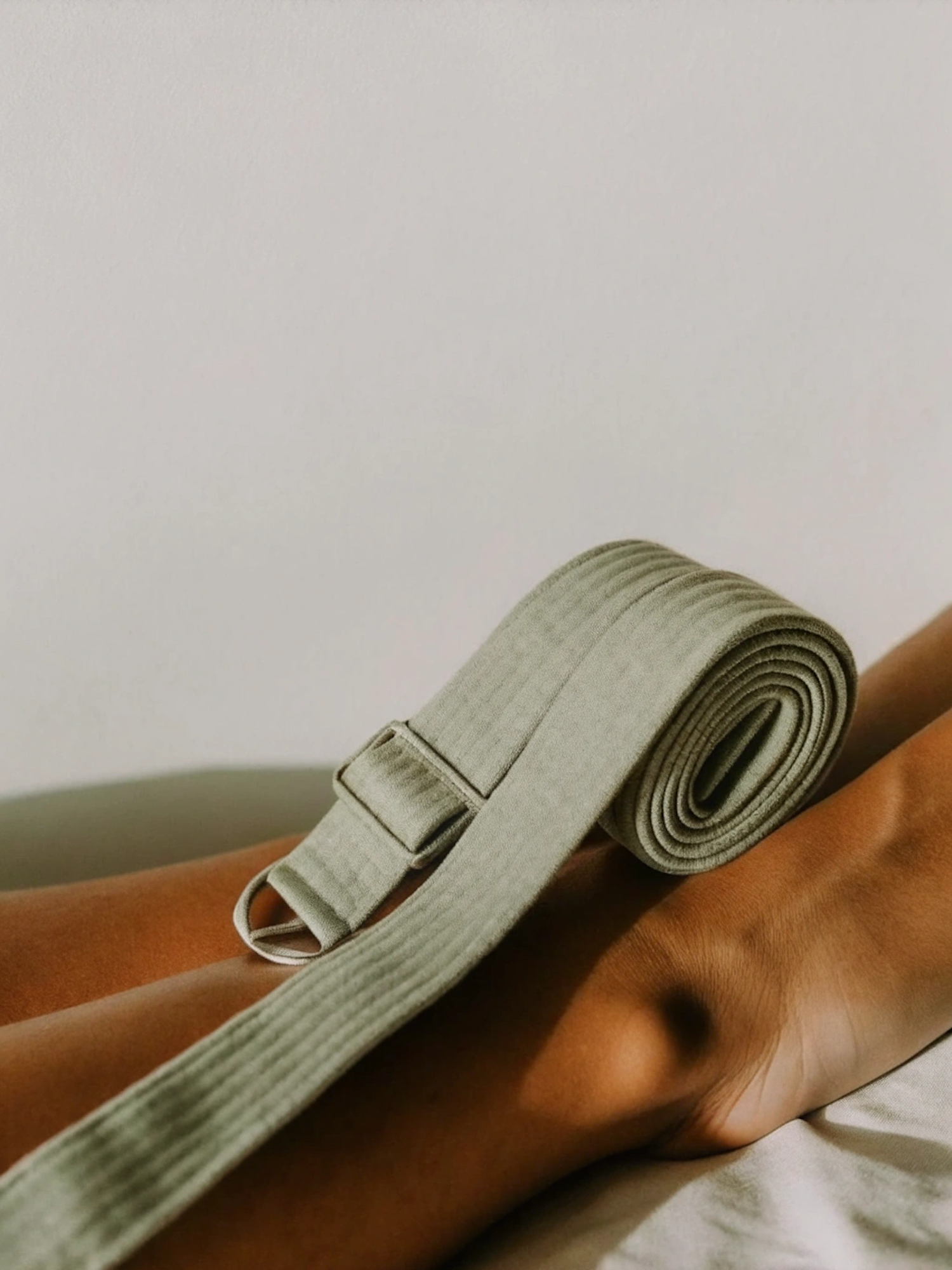 A beige yoga strap with a metal D-ring rests on a warm-toned leg against a light background, creating a serene and minimalist vibe.