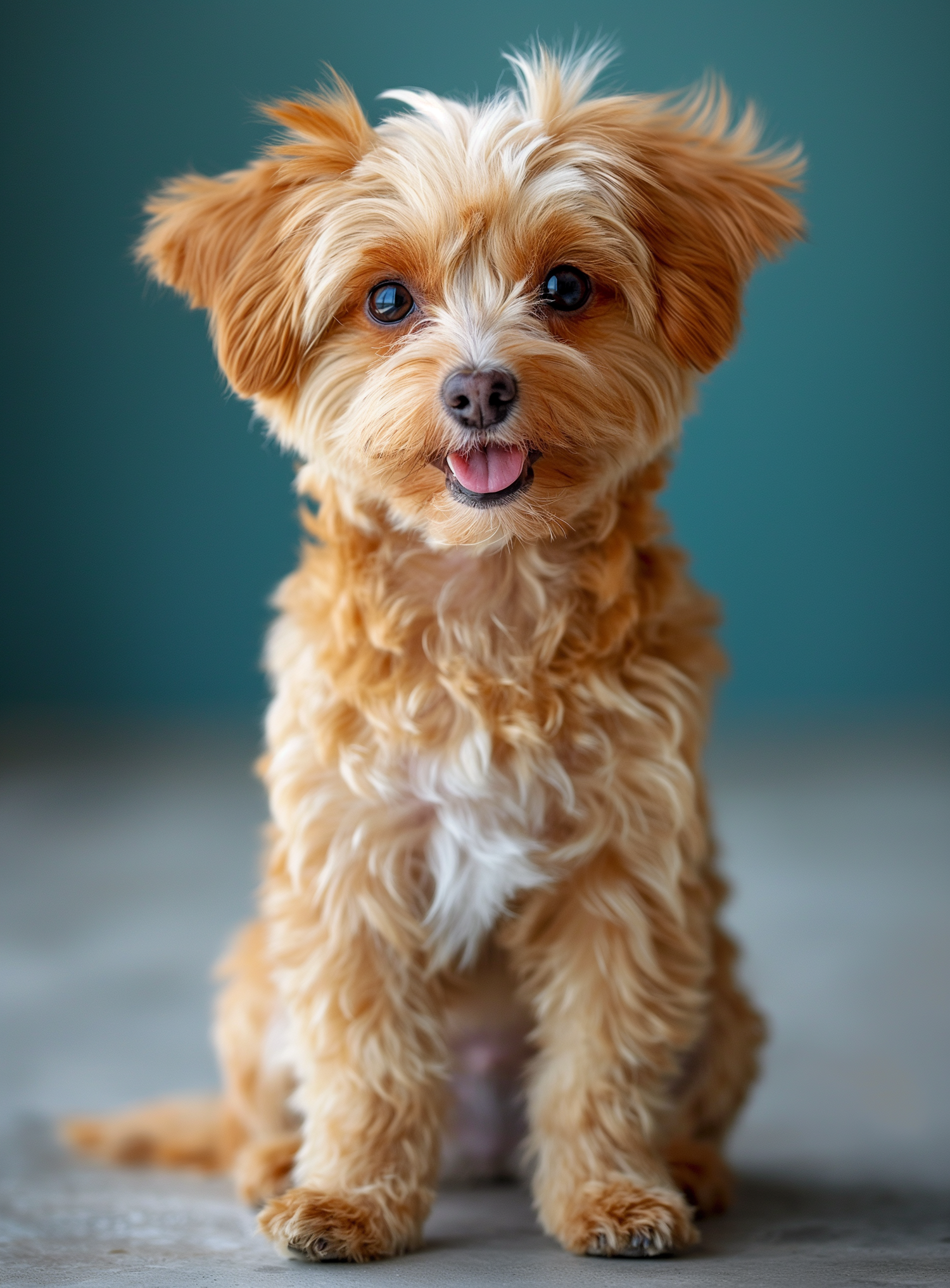 Adorable fluffy dog with golden-brown fur and expressive eyes sitting against a teal background, exuding charm and playfulness.