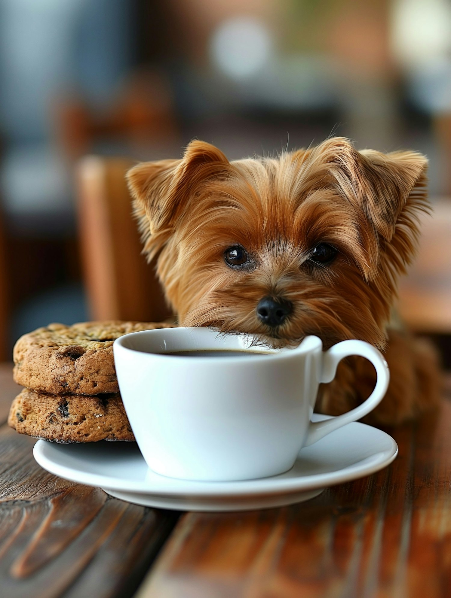 Adorable Yorkshire Terrier peeking over a coffee cup with chocolate chip cookies on a wooden table in a cozy setting.
