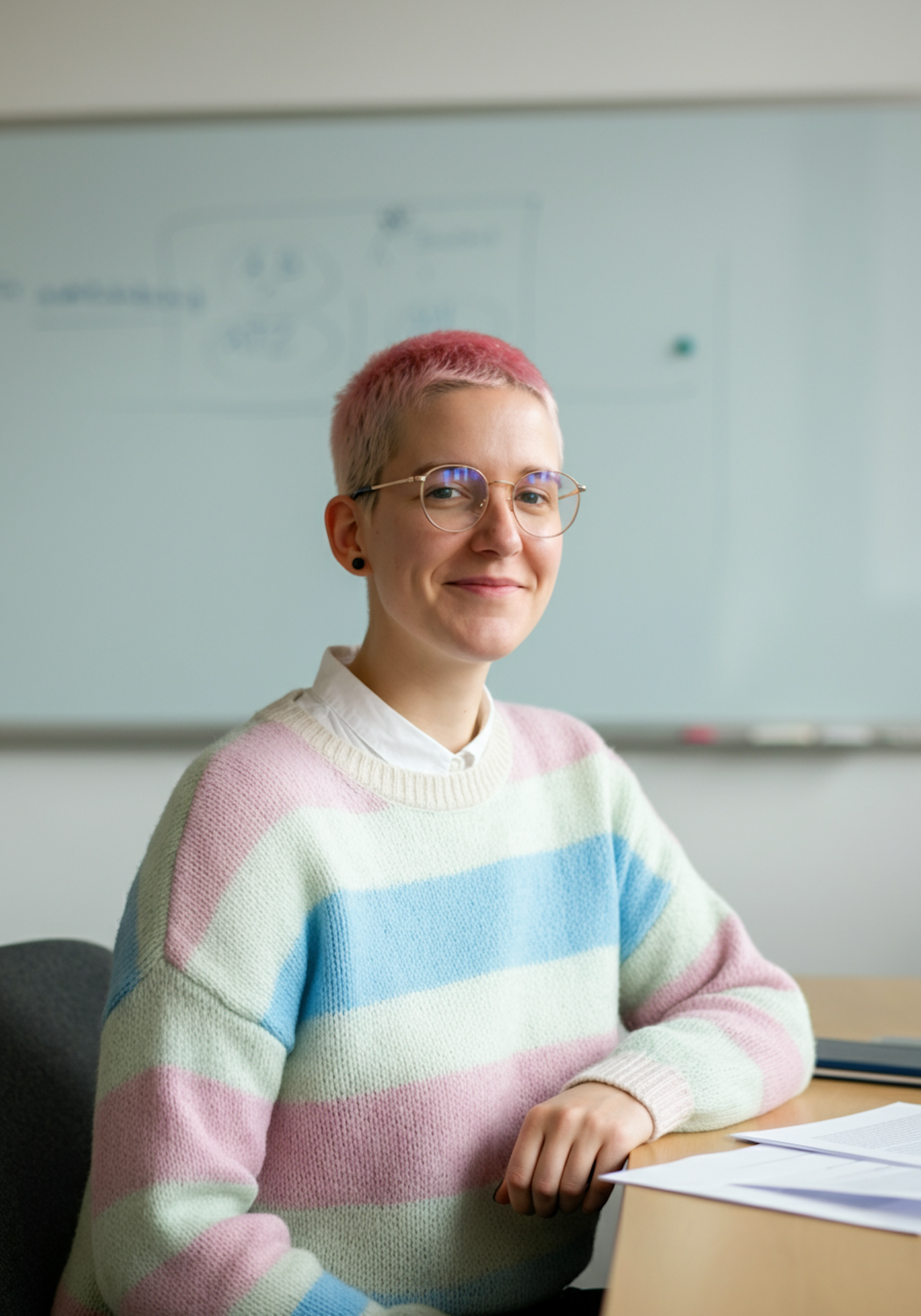 A person with pink hair and glasses wearing a pastel-striped sweater sits at a desk in a bright, professional setting.