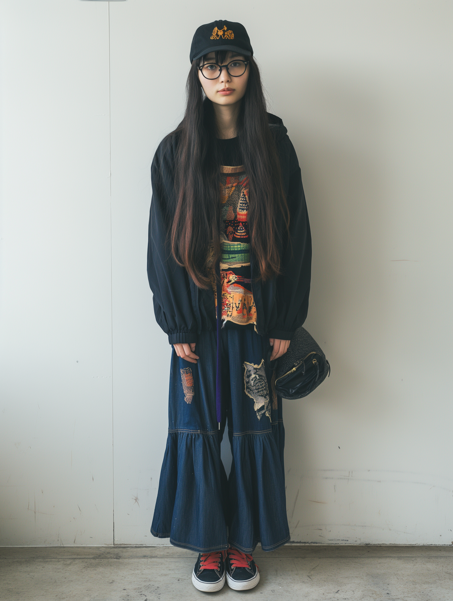 Asian woman in casual artistic outfit with black cap, glasses, and patchwork denim pants, standing against a white wall.