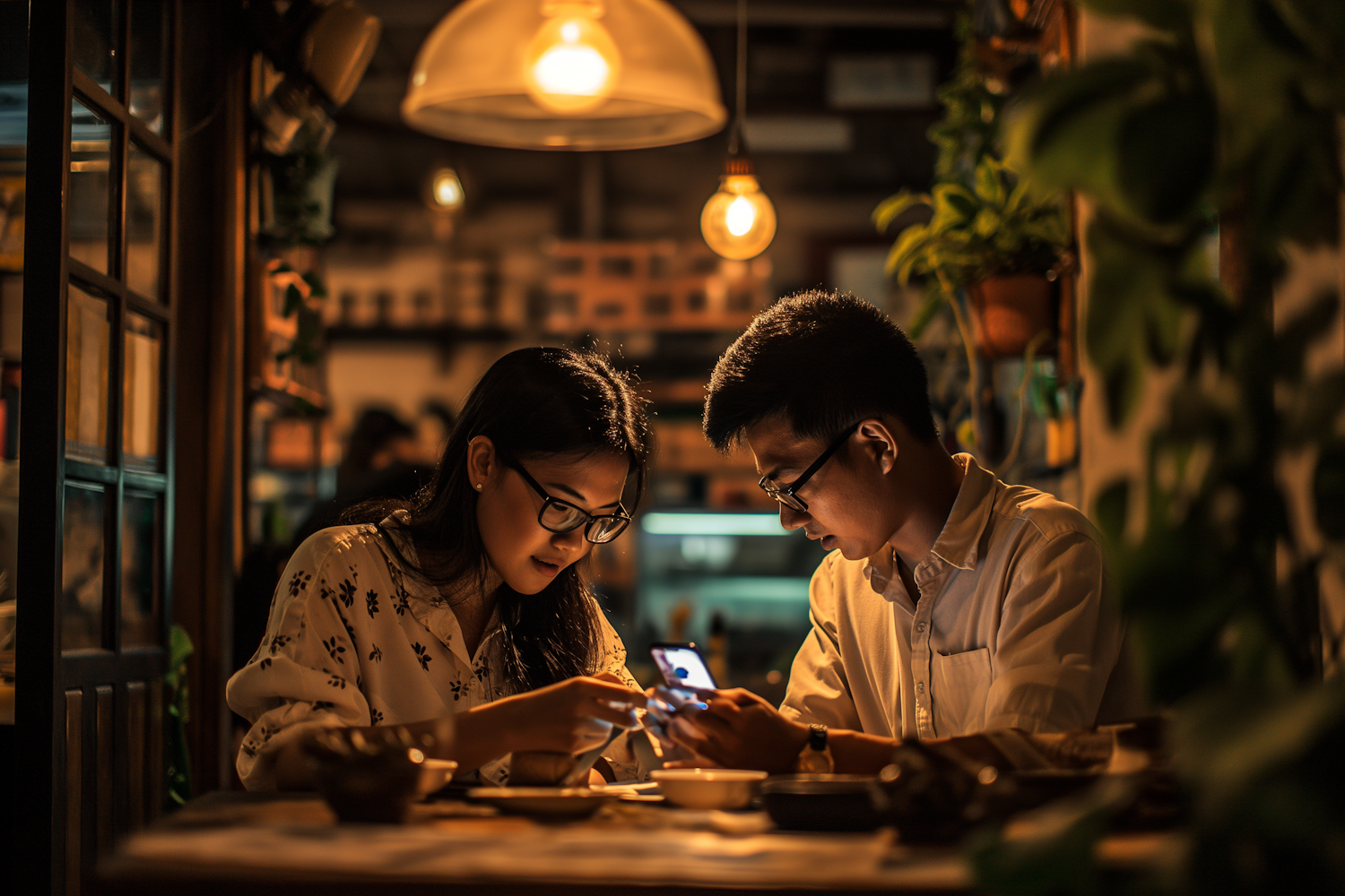 Two people in a cozy setting, focused on their smartphones under warm lighting, creating an intimate and relaxed atmosphere.