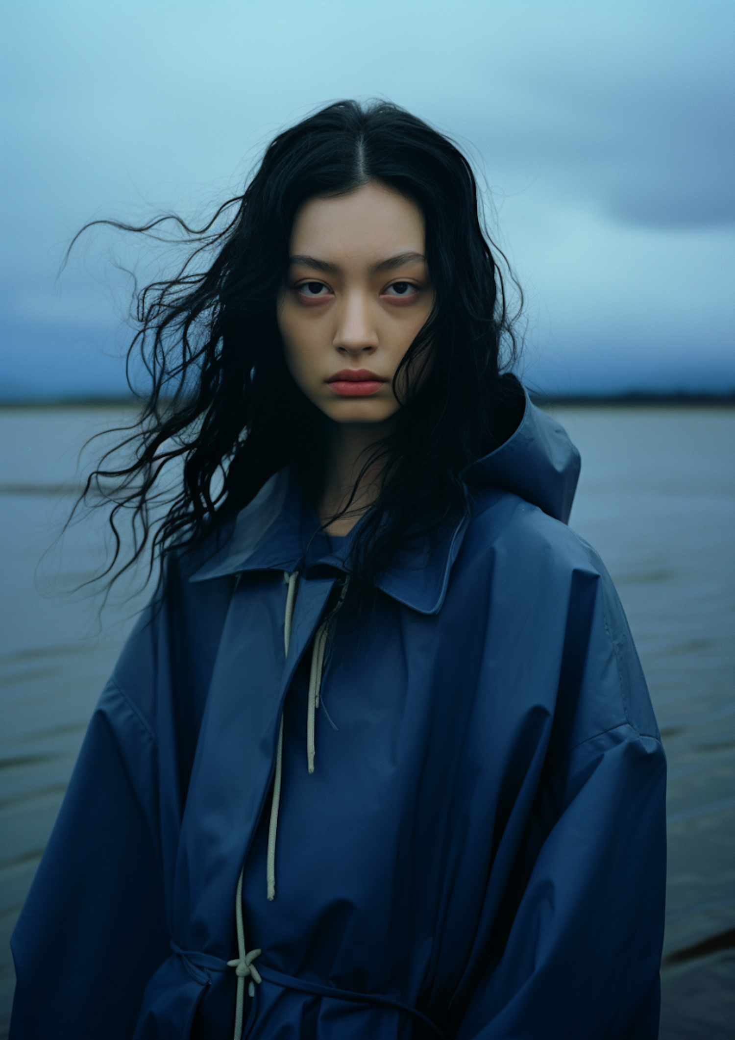 Asian woman in a blue raincoat by the water, with wind-tousled hair and a serious expression, under an overcast sky.