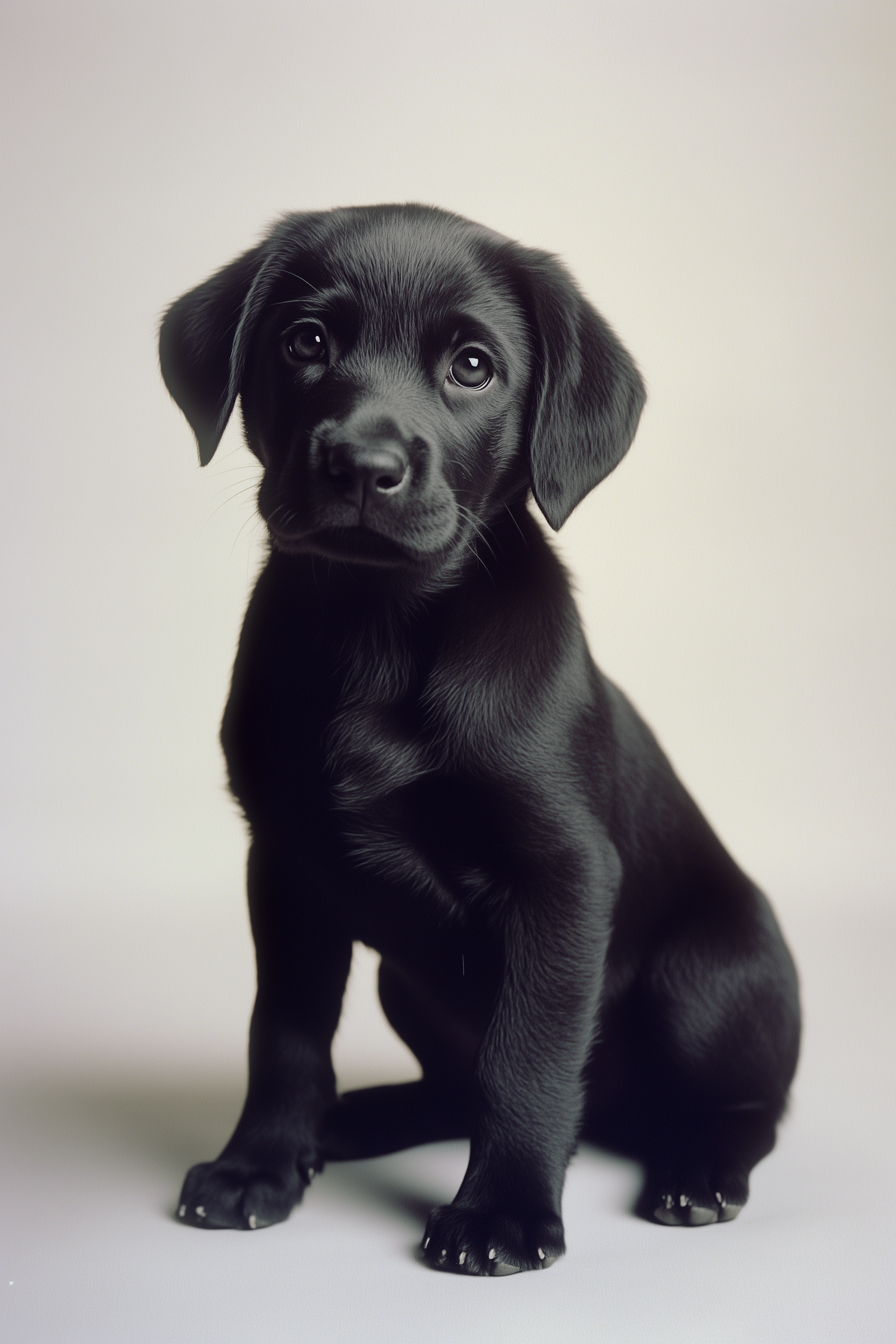 Adorable black Labrador puppy with shiny fur and expressive eyes sitting against a neutral background.