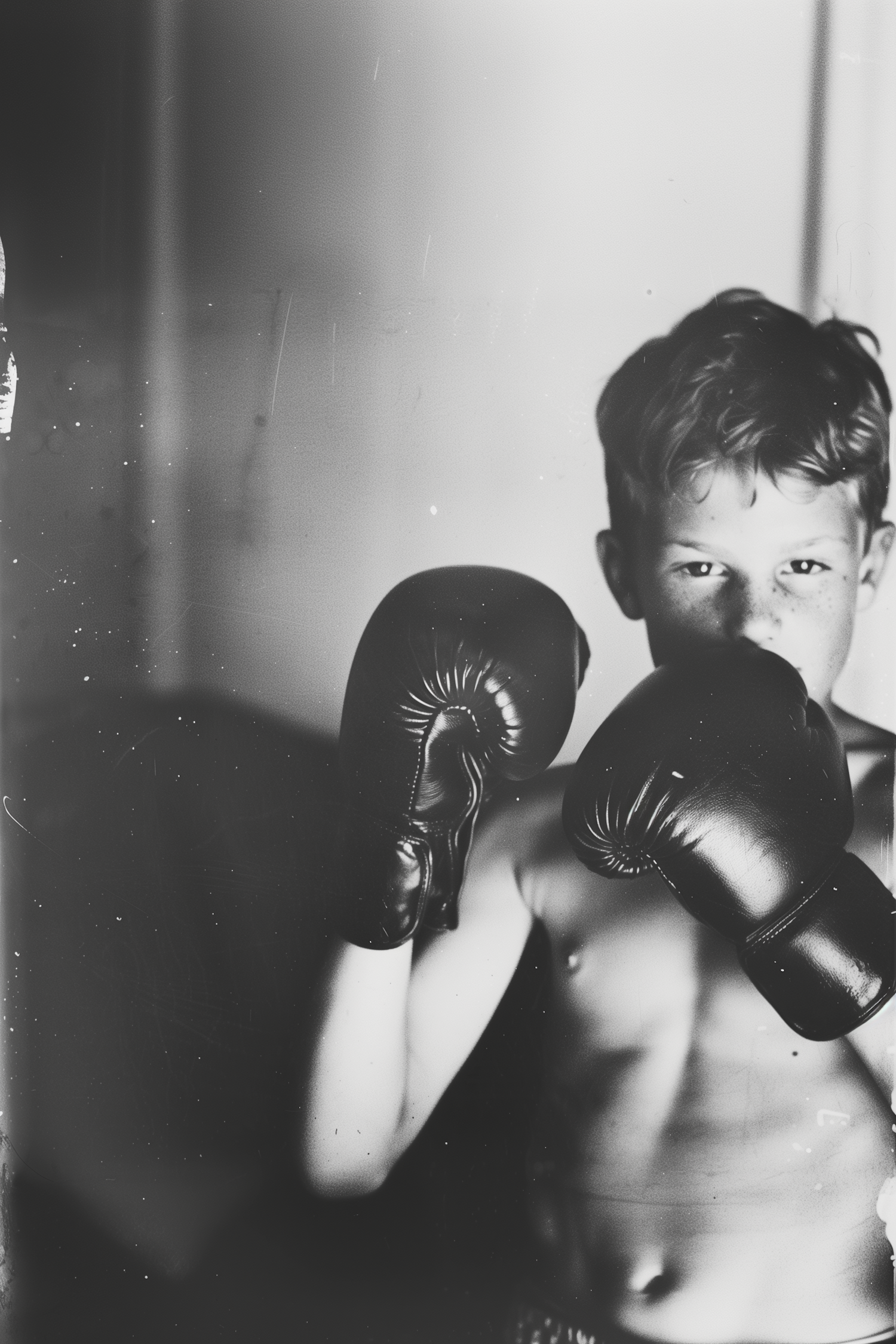 Black-and-white photo of a freckled boy in boxing gloves, shirtless, in a focused stance with dramatic lighting and a vintage feel.