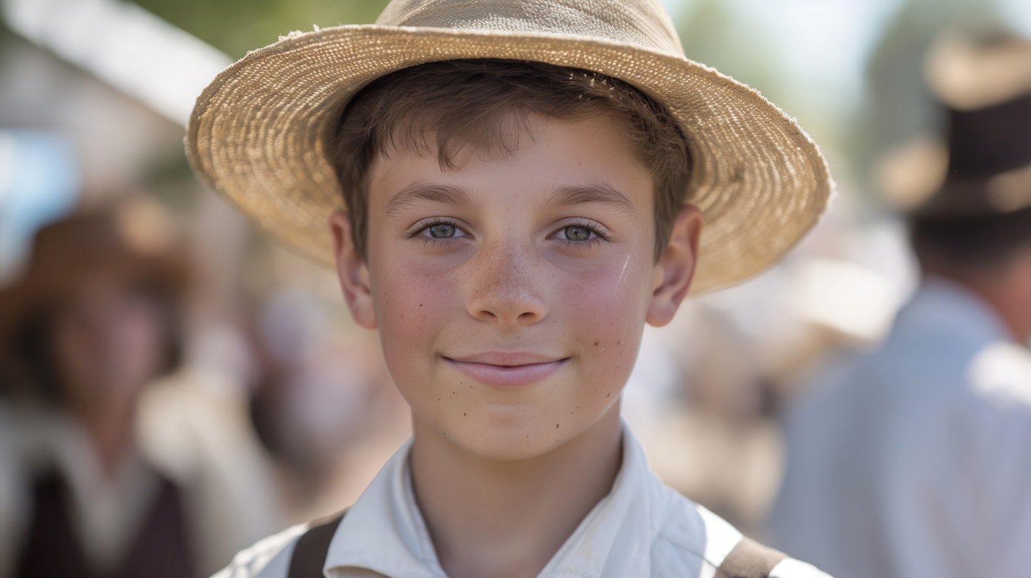 Smiling boy in a straw hat with blue eyes and freckles, wearing a white shirt. Outdoor setting with a nostalgic, rustic feel.
