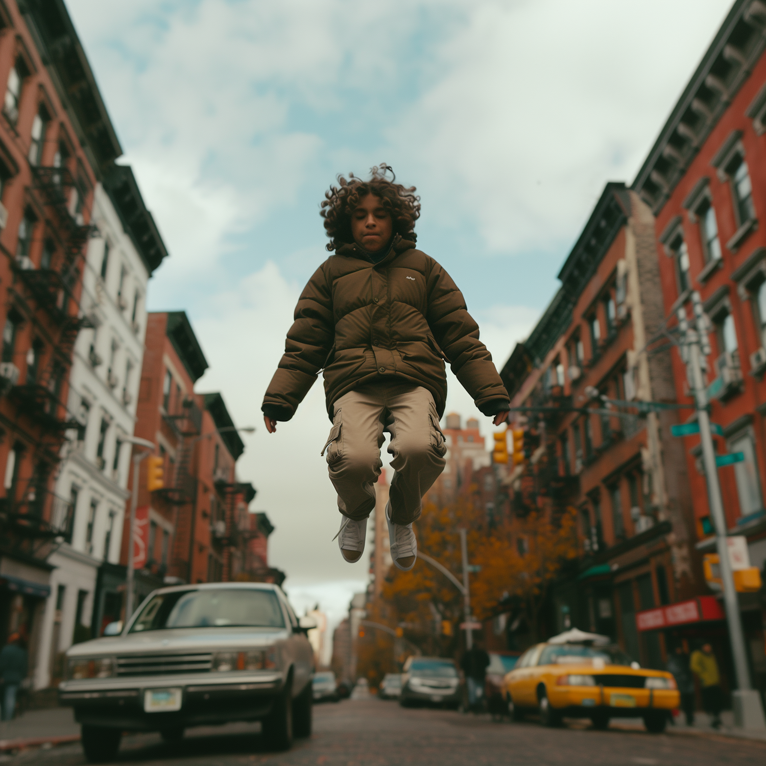 Boy in brown jacket jumps on city street with red brick buildings and cars, including a yellow taxi, in the background.