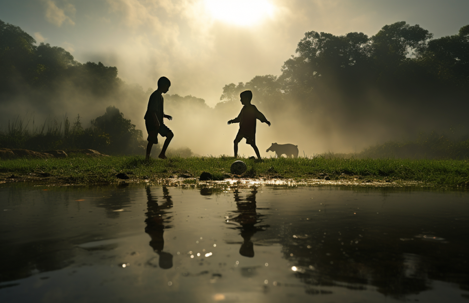 Silhouetted children play with a ball in a misty, sunlit field, with reflections in water and a cow grazing in the background.