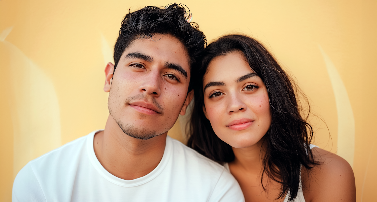 Young couple with dark hair and medium skin tone against a warm yellow background, exuding a relaxed and connected vibe.