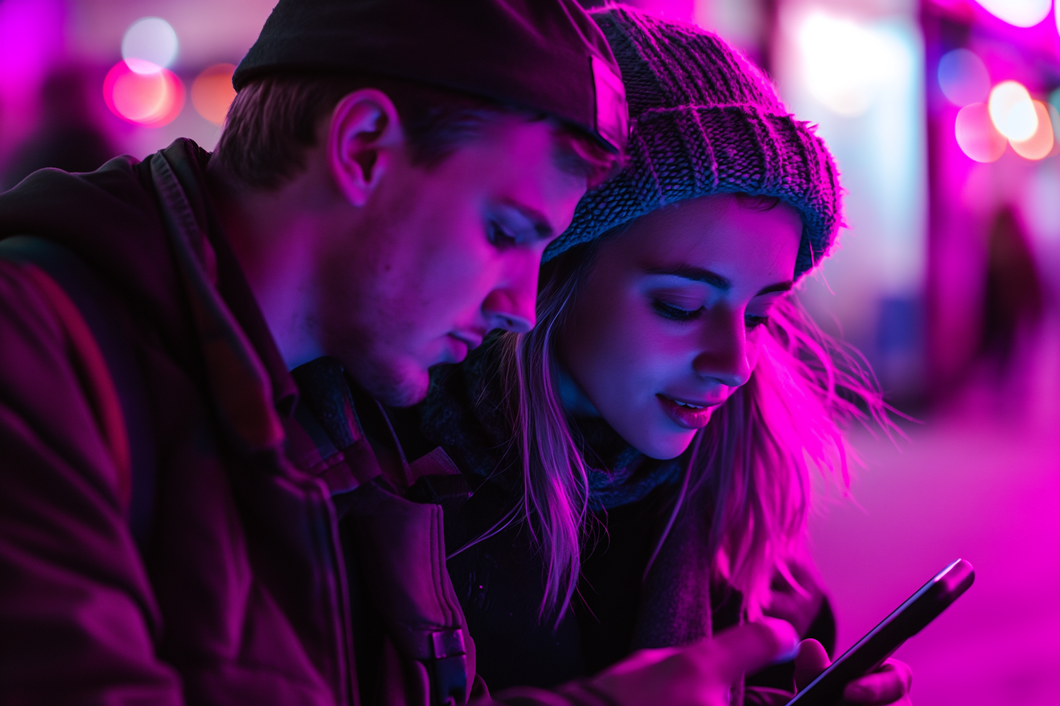 Young couple under neon lights, focused on a smartphone, creating a vibrant urban night scene with pink and purple hues.