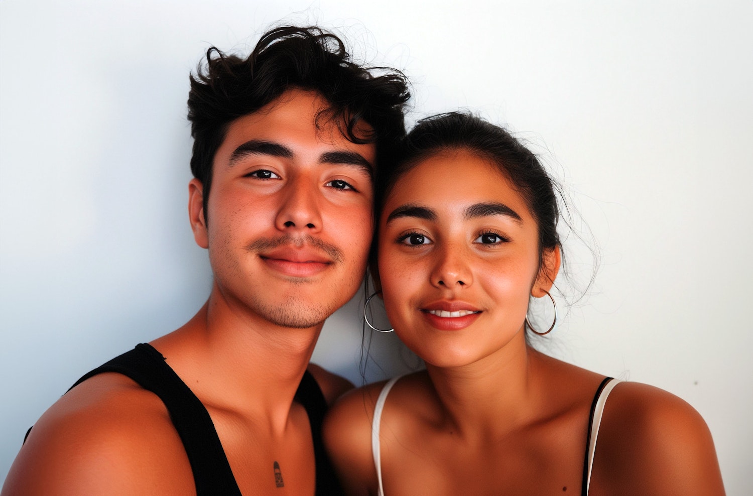 Young couple smiling warmly against a white background, showcasing a close and intimate connection.