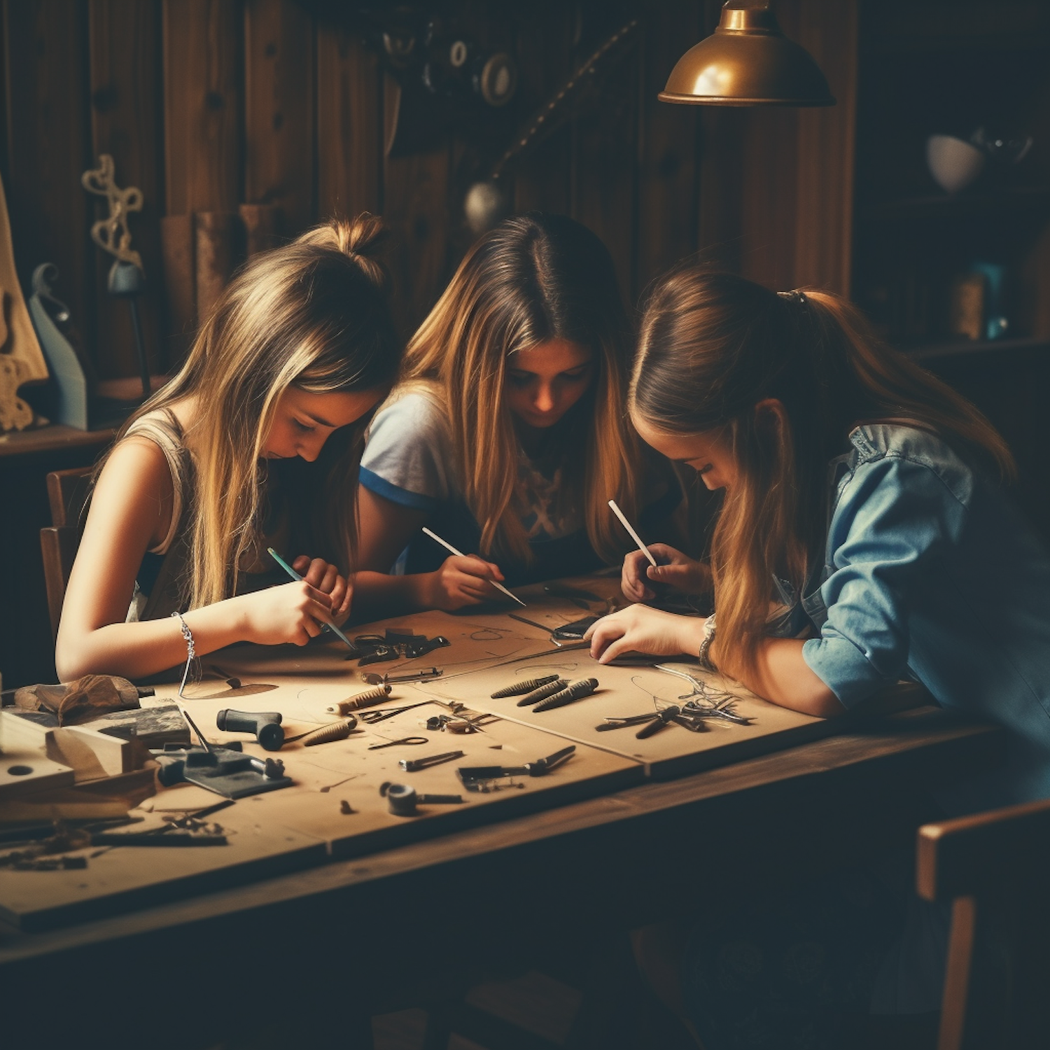 Three young girls crafting together at a wooden table, focused and creative in a warmly lit workshop setting.