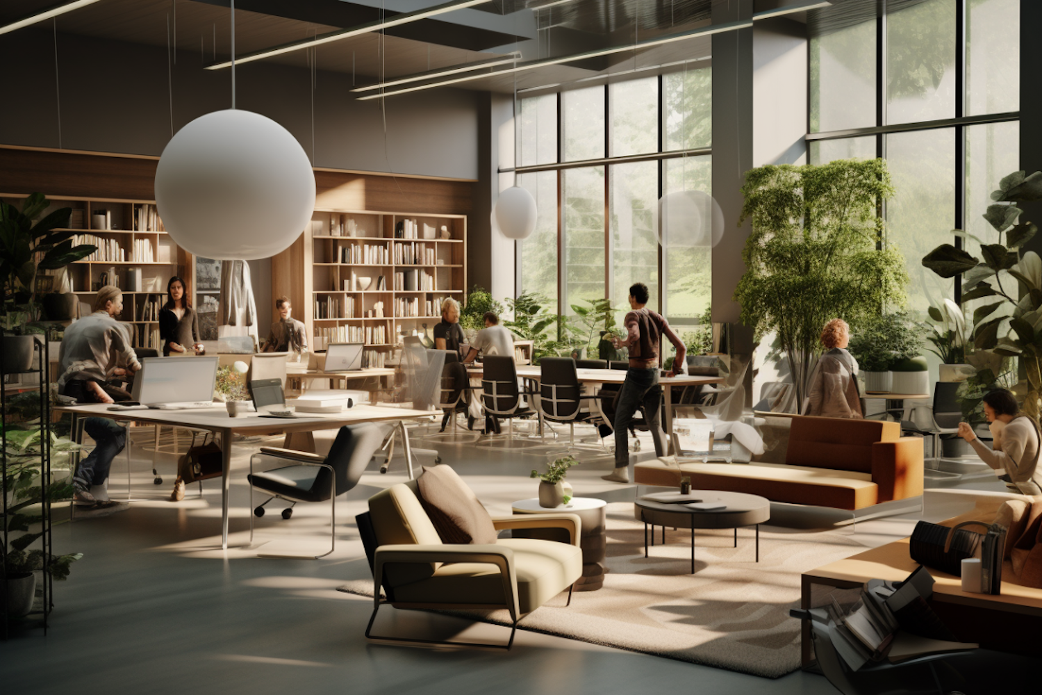 Modern open office with natural light, greenery, sleek furniture, and people working or conversing in a collaborative environment.