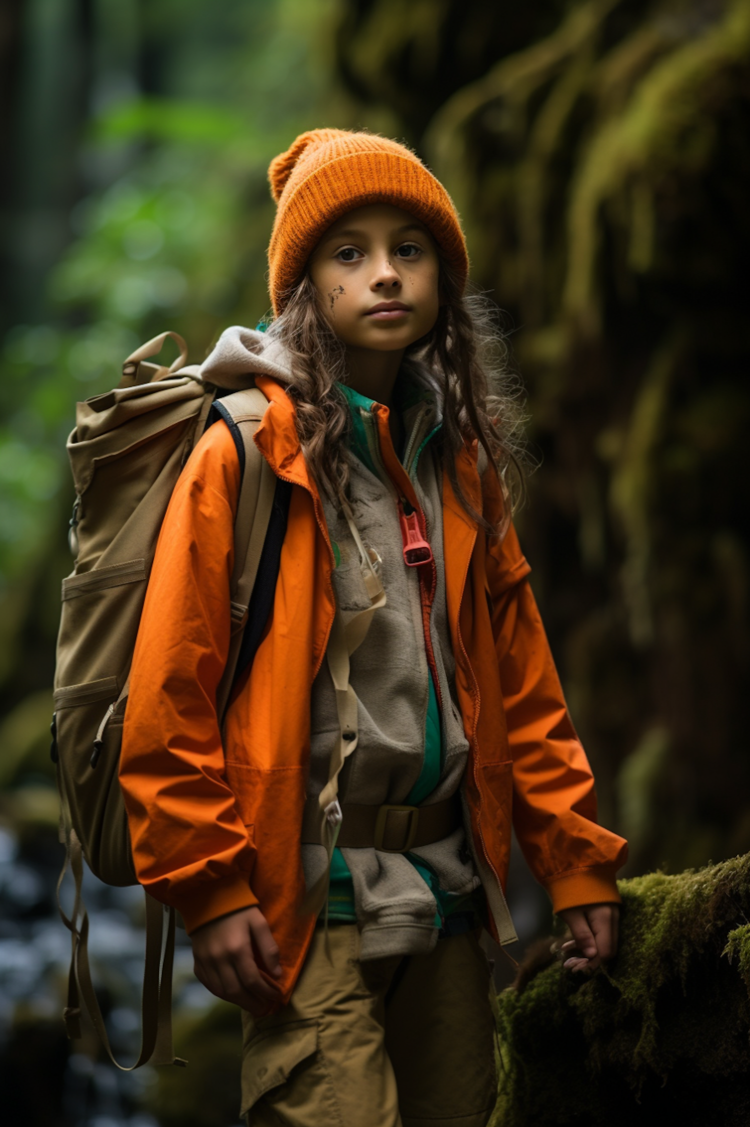 Child in orange jacket and beanie hiking in a lush forest, carrying a backpack. Adventure and exploration theme.