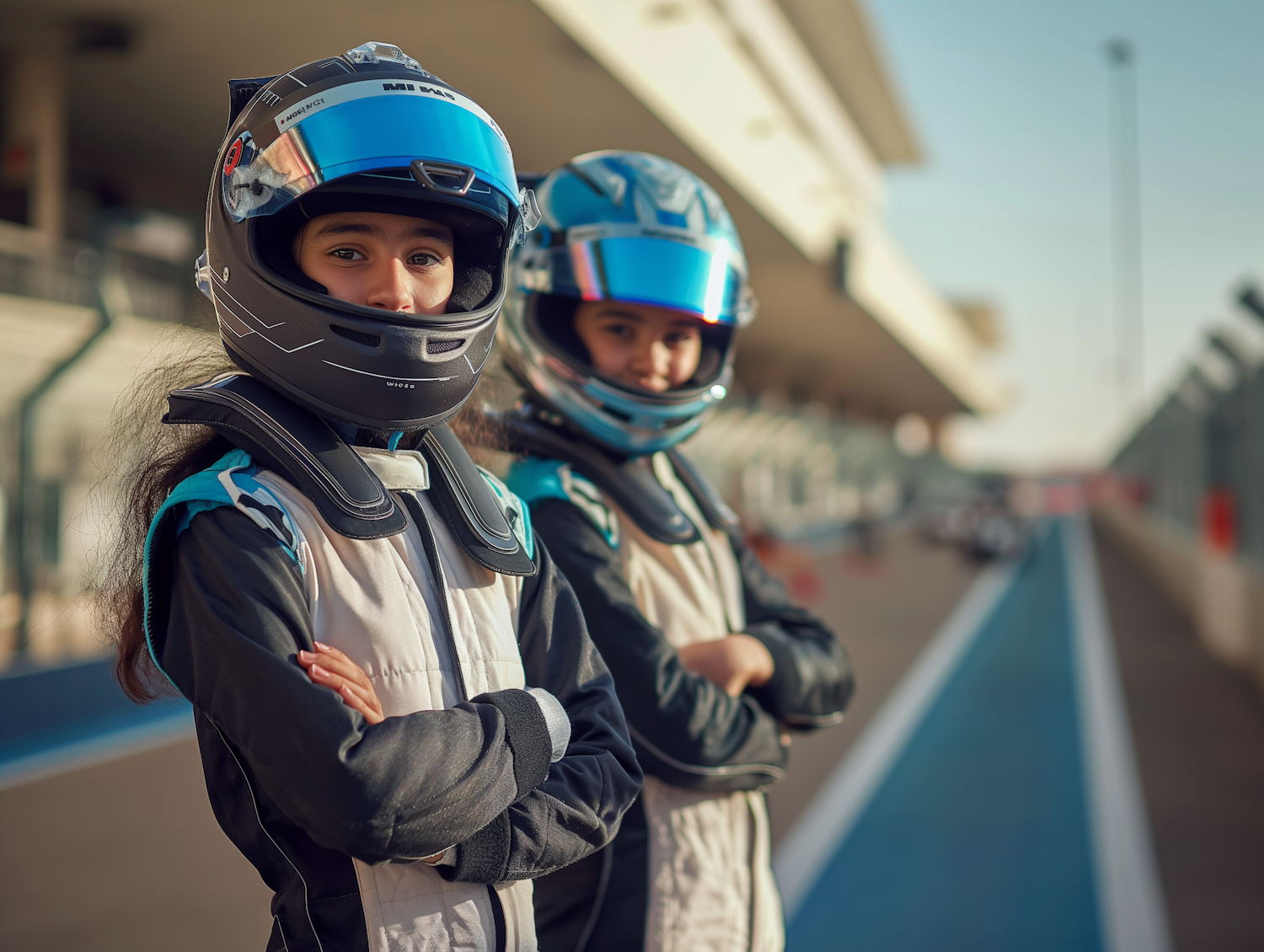 Two young racers in full gear stand confidently on a racetrack, ready for action. Bright day, professional setting, and determined expressions.