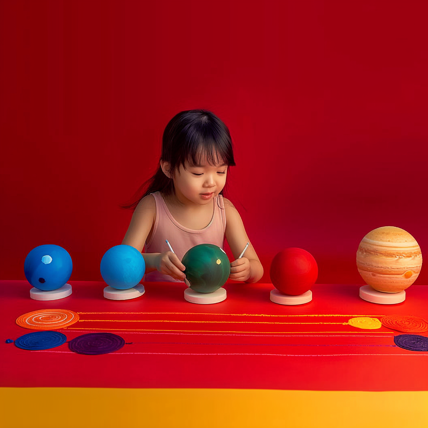 A young girl paints colorful planet models on a vibrant red background, showcasing creativity and learning.
