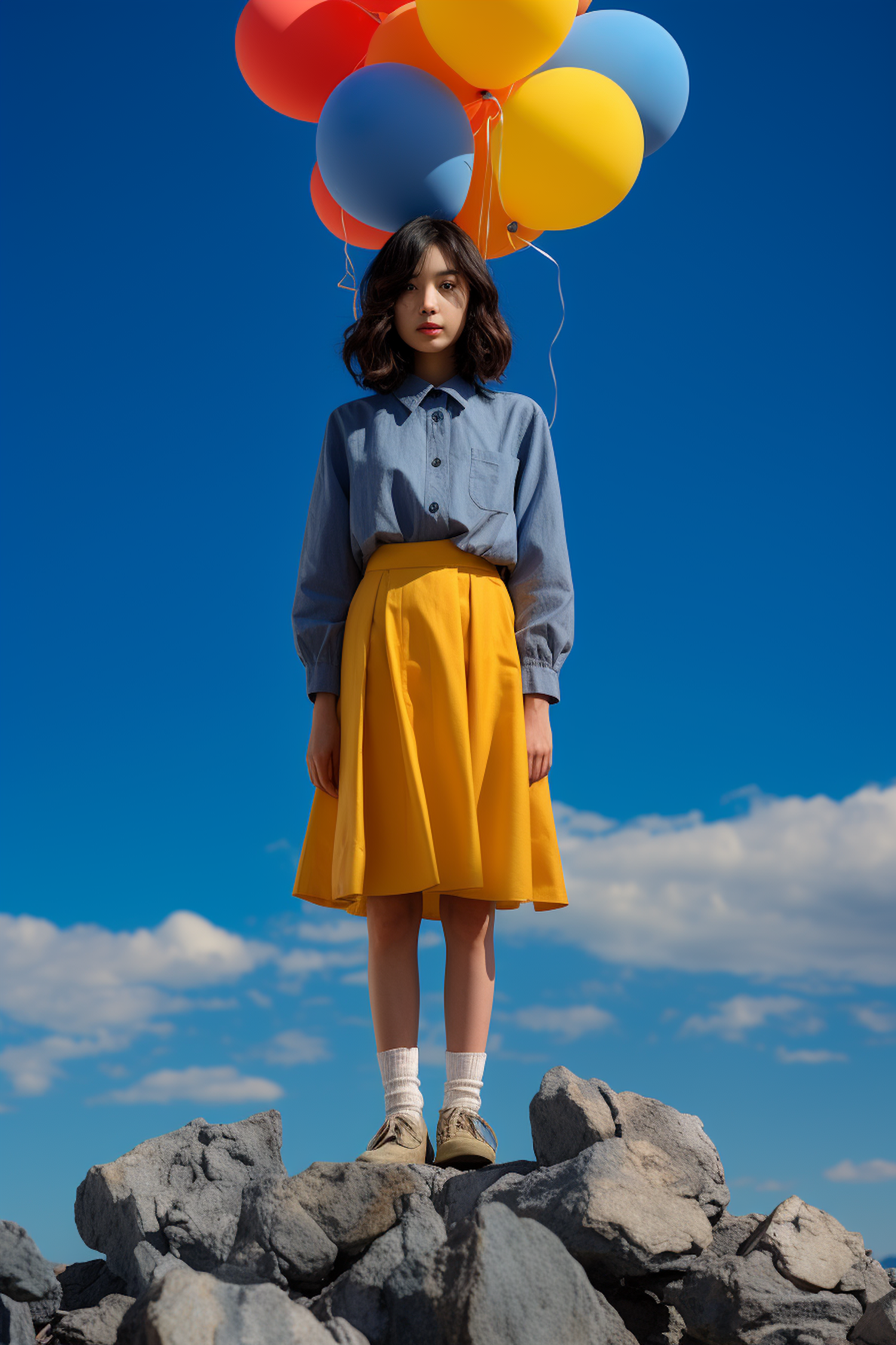 Young girl in blue shirt and yellow skirt holding colorful balloons on rocks against a clear blue sky.
