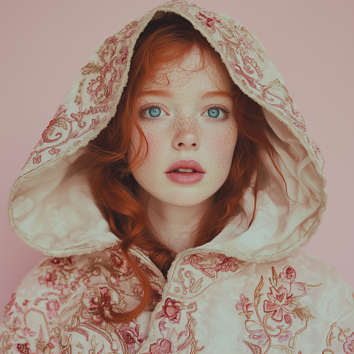 Portrait of a red-haired woman with freckles, wearing an embroidered hooded cloak against a pastel pink background.