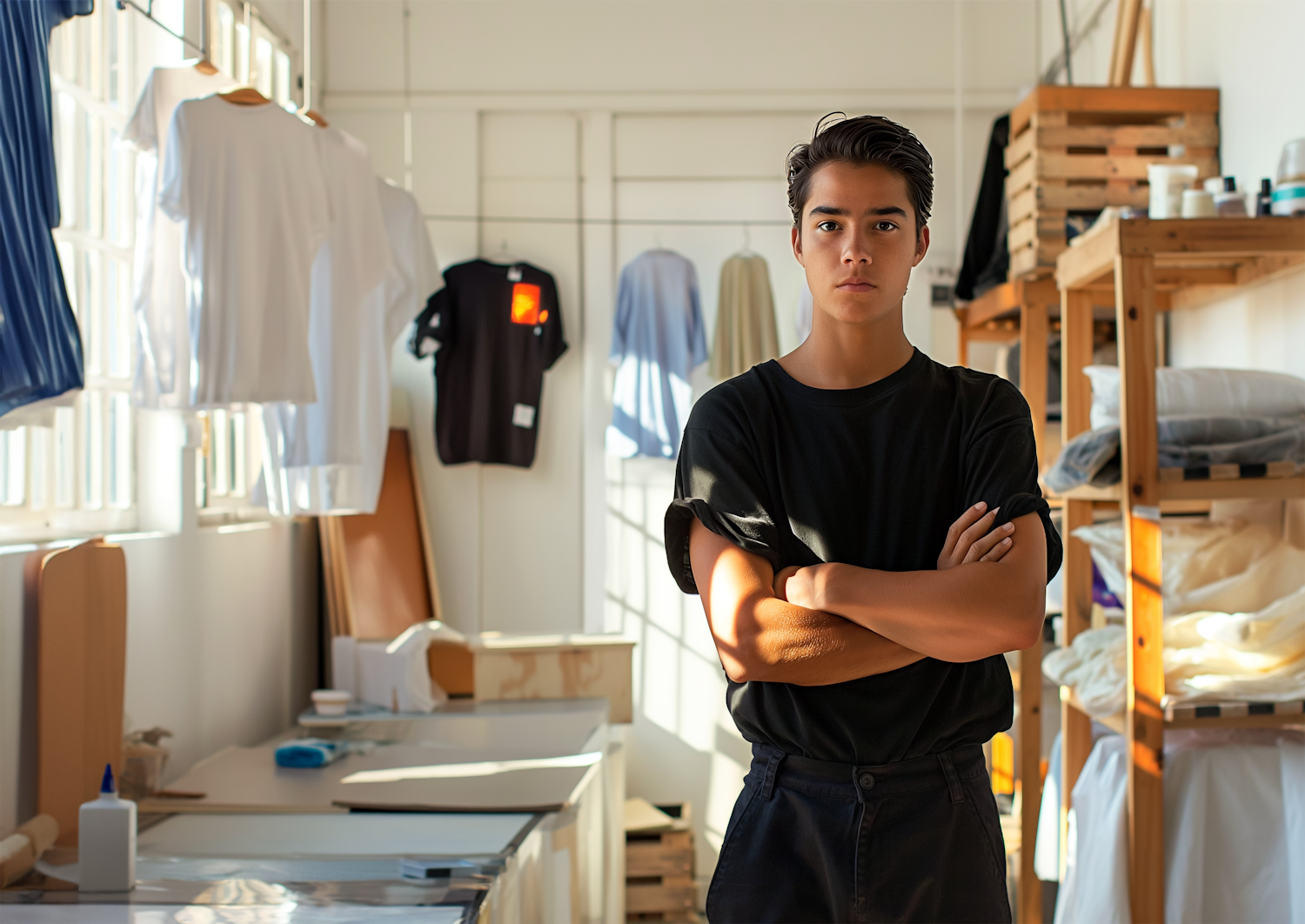 Young man in a clothing studio with arms crossed, surrounded by hanging t-shirts and shelves of materials, bathed in sunlight.