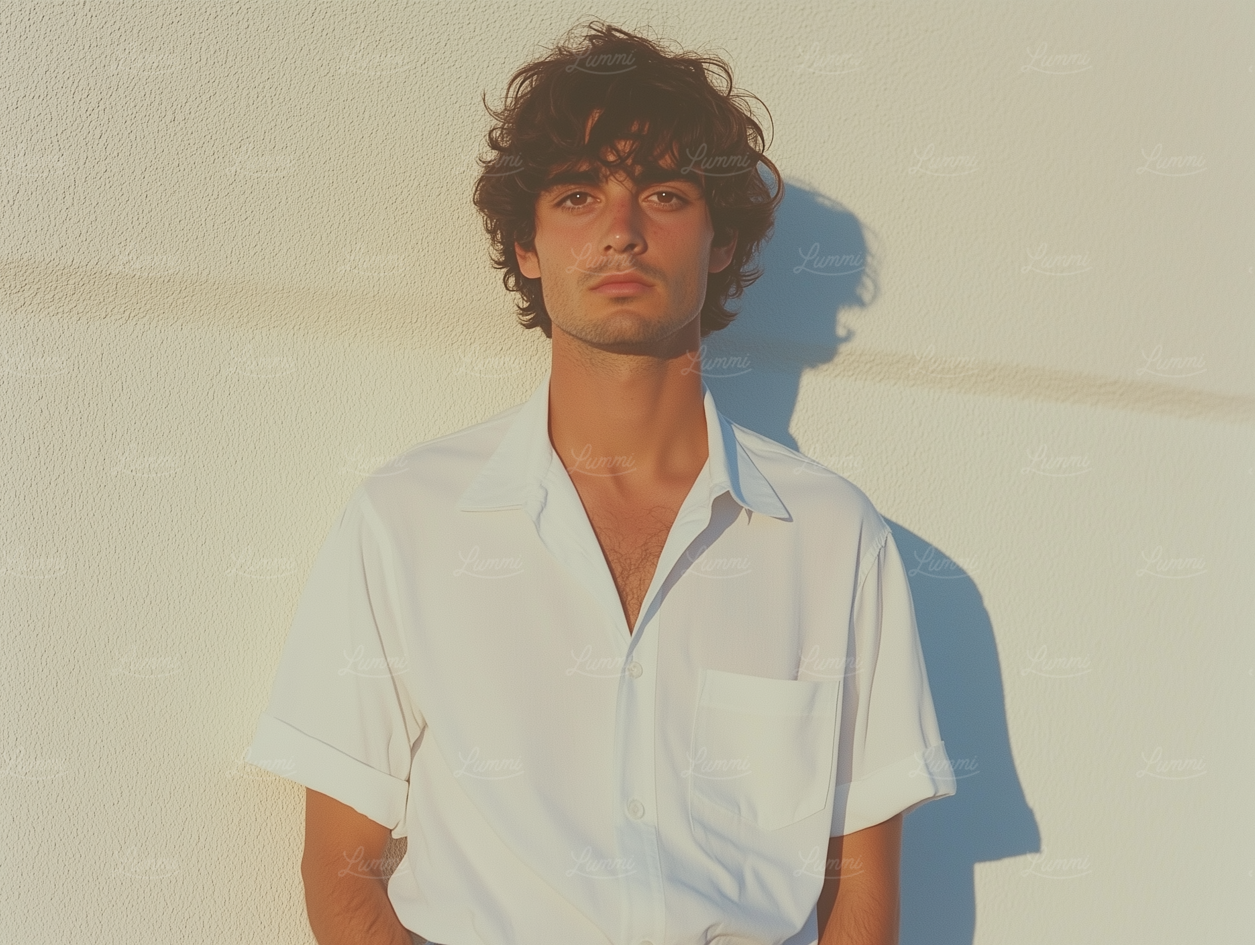 Young man with curly hair in a white shirt against a sunlit wall, casting a soft shadow. Warm tones and direct gaze create a serene vibe.