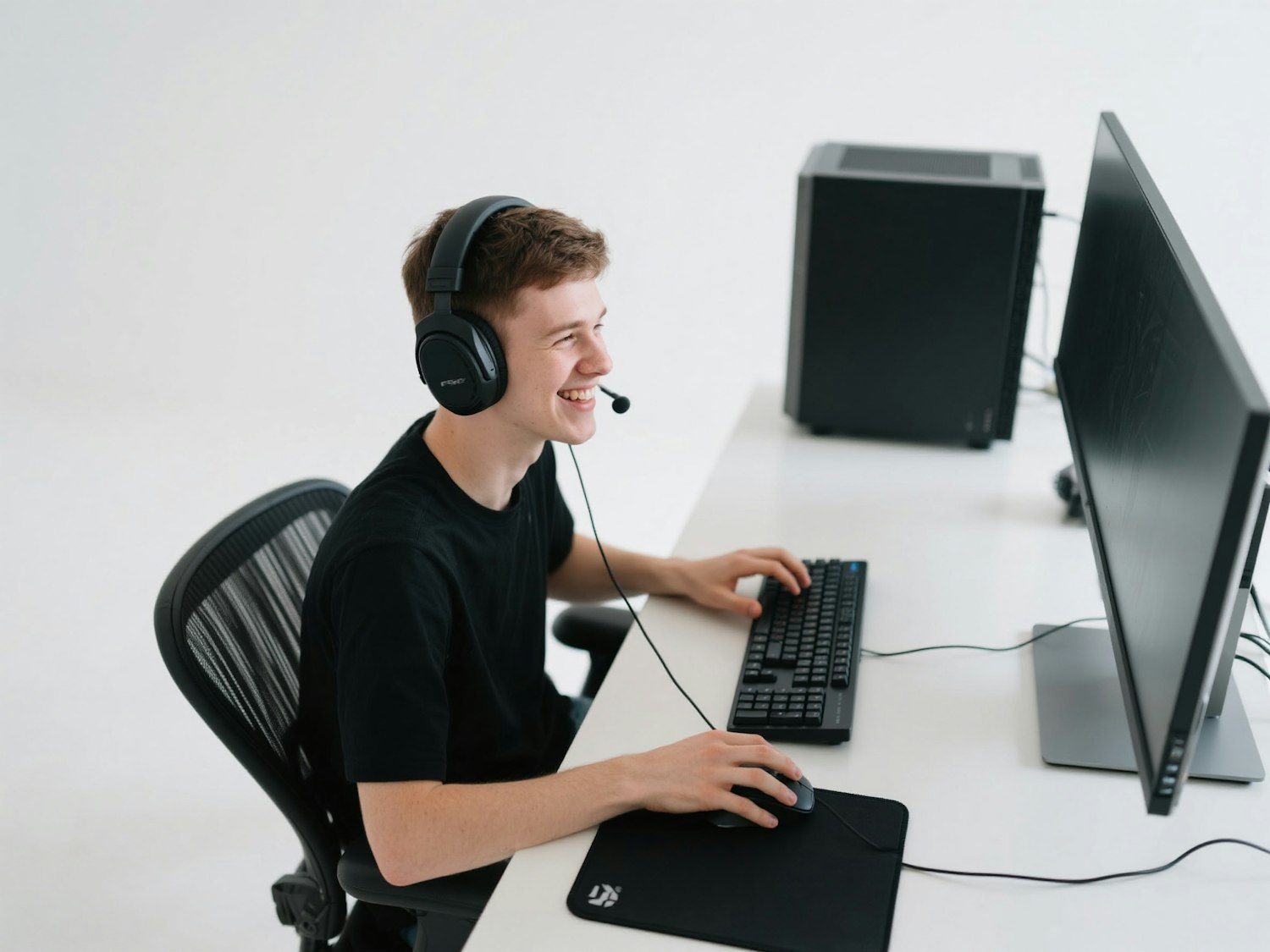 a gamer male, white solid background, gaming at his gaming pc, seen from above a little bit, the monitor is not visible, he has gaming black headphones with no cable. he is smiling. clean setup
