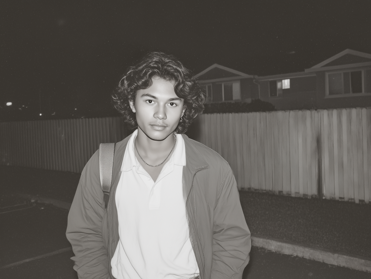 Young man with wavy hair and a backpack standing outdoors at night, wearing a white shirt and jacket, with houses in the background.