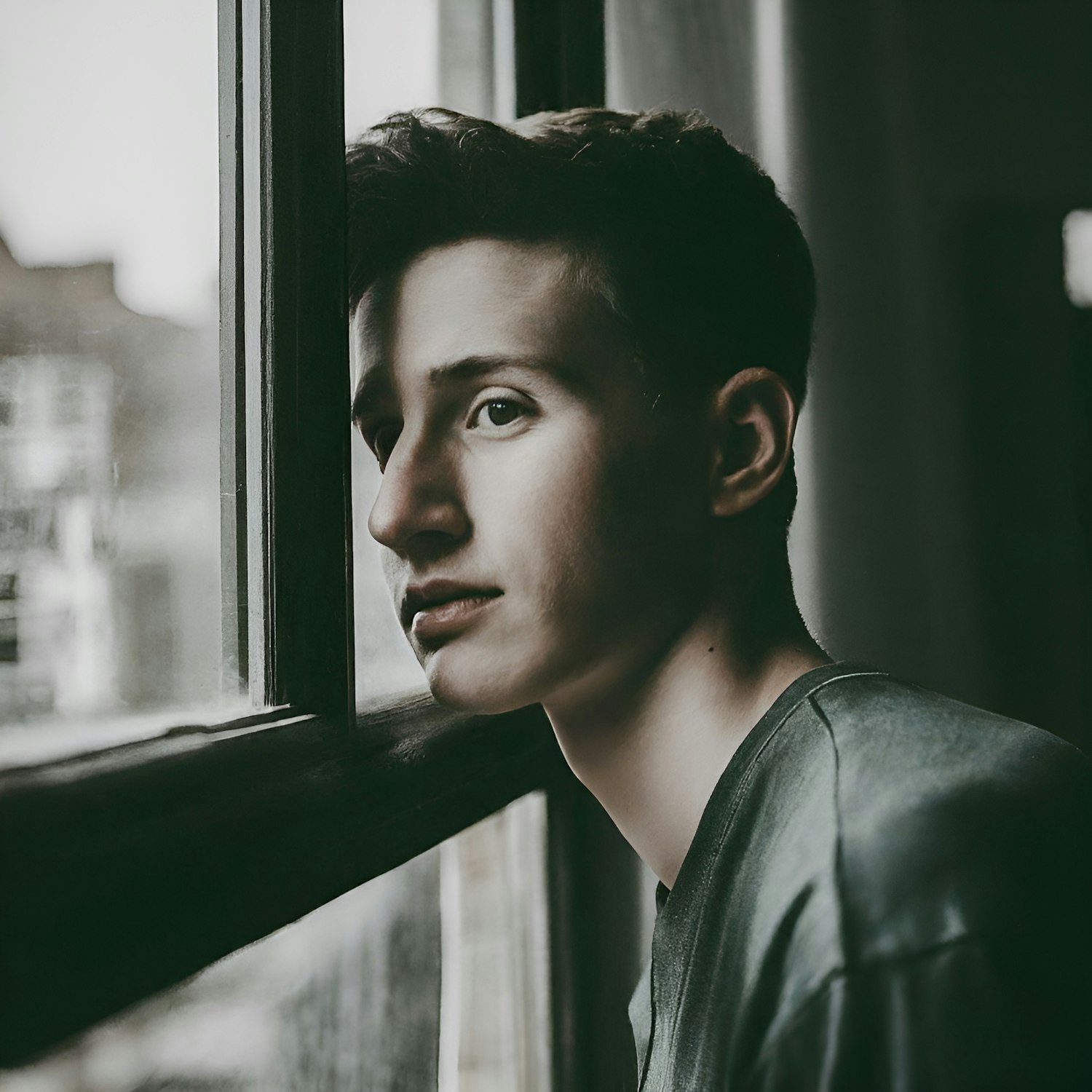 Young man with dark hair gazes thoughtfully out a window, wearing a dark shirt. Soft lighting highlights his contemplative expression.